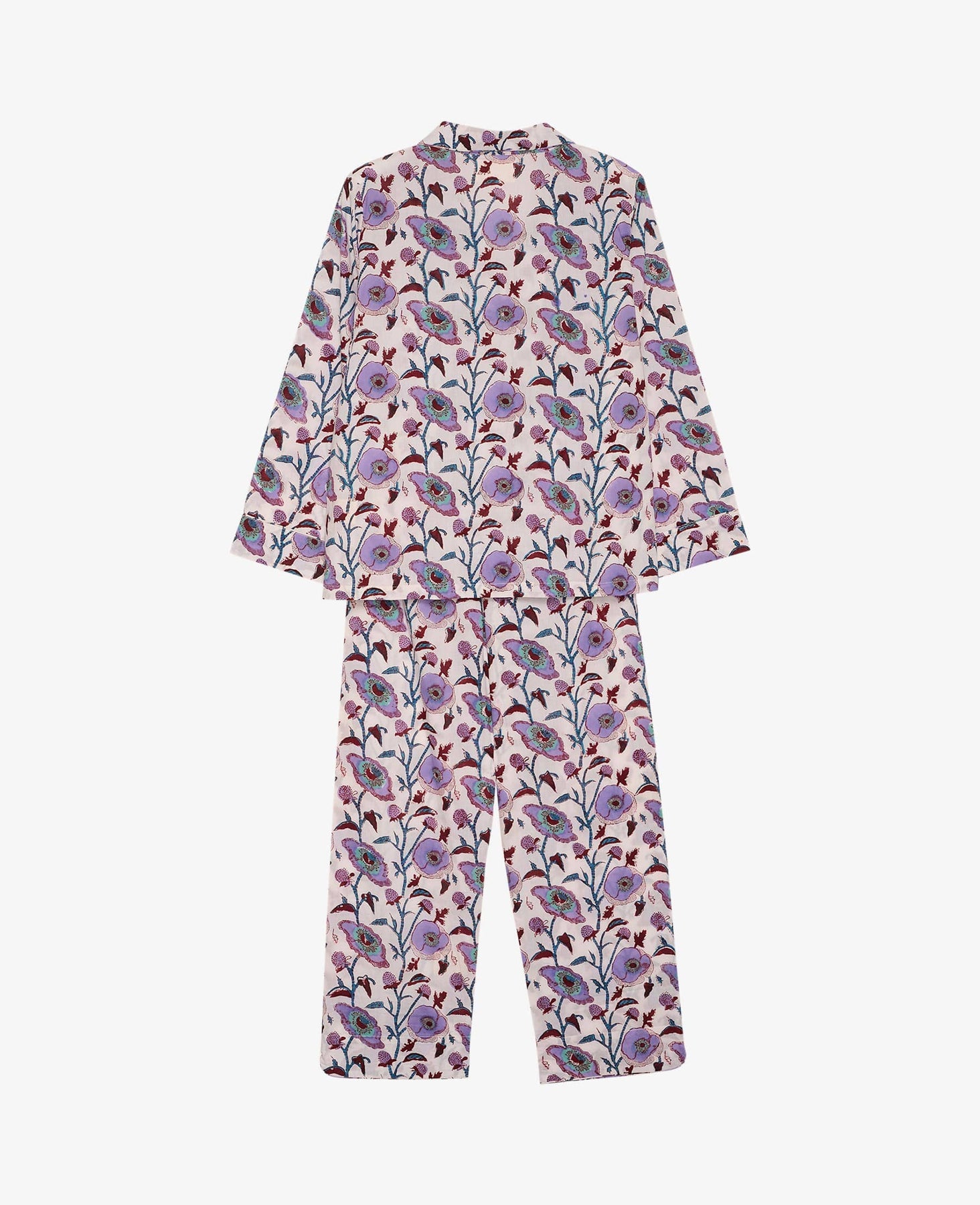 Ensemble de pyjama Sissel Edelbo avec motif floral violet. L’ensemble est fabriqué en 100 % coton biologique et orné de motifs traditionnels indiens réalisés au bloc.