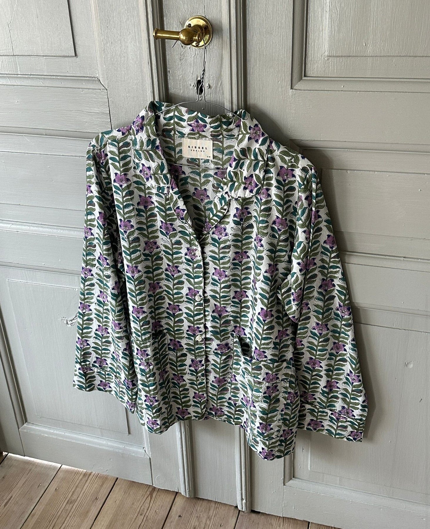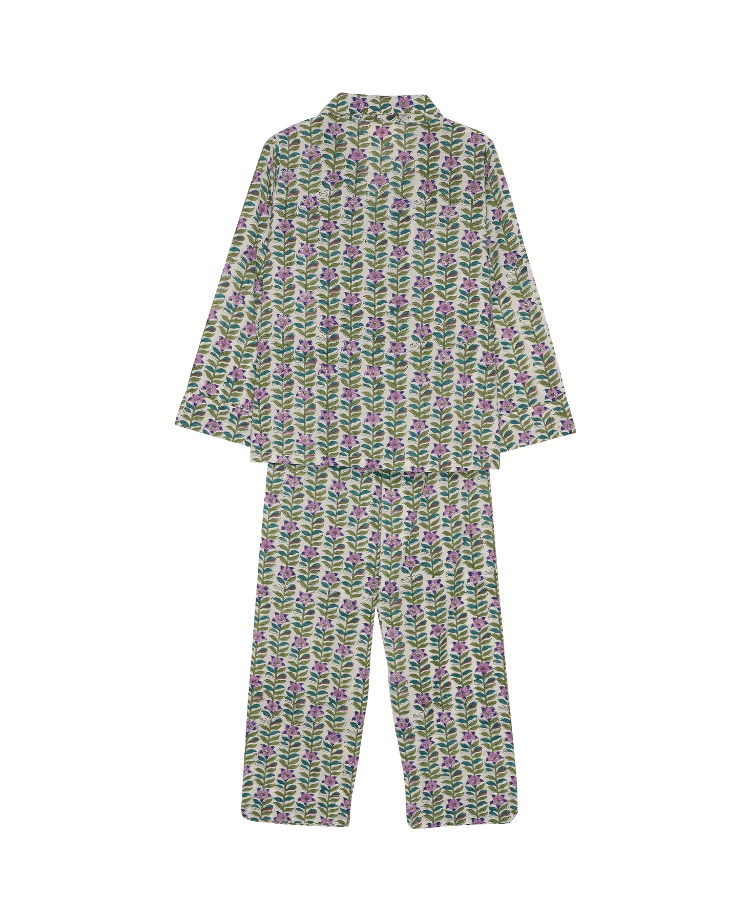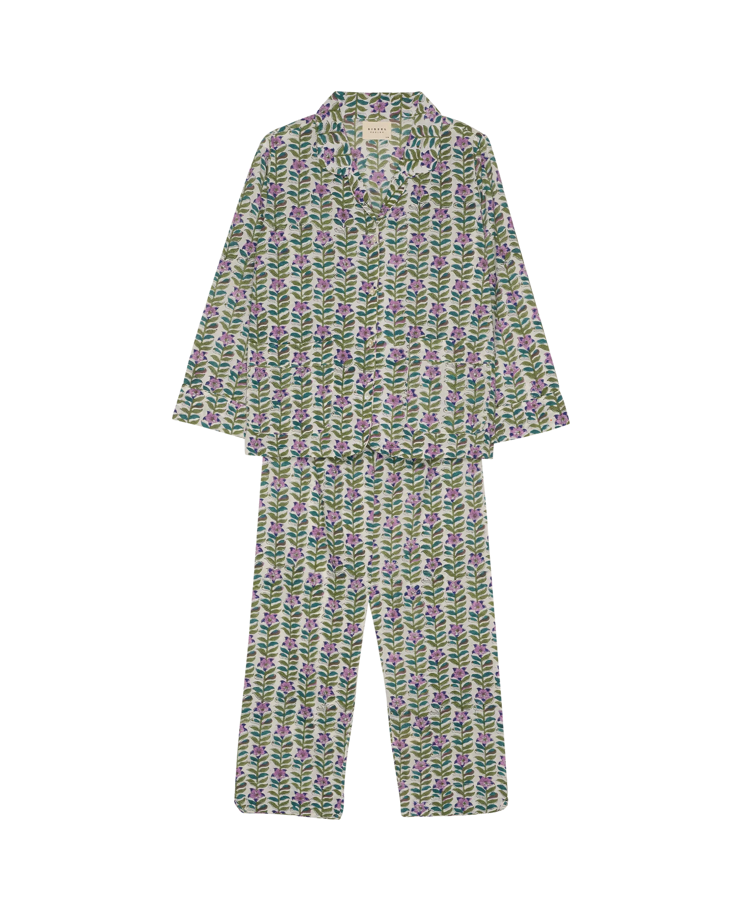 Ensemble pyjama de Sissel Edelbo avec un motif de fleurs violettes et de feuilles vertes. L'ensemble se compose d'une chemise à manches longues avec col et d'un pantalon assorti.