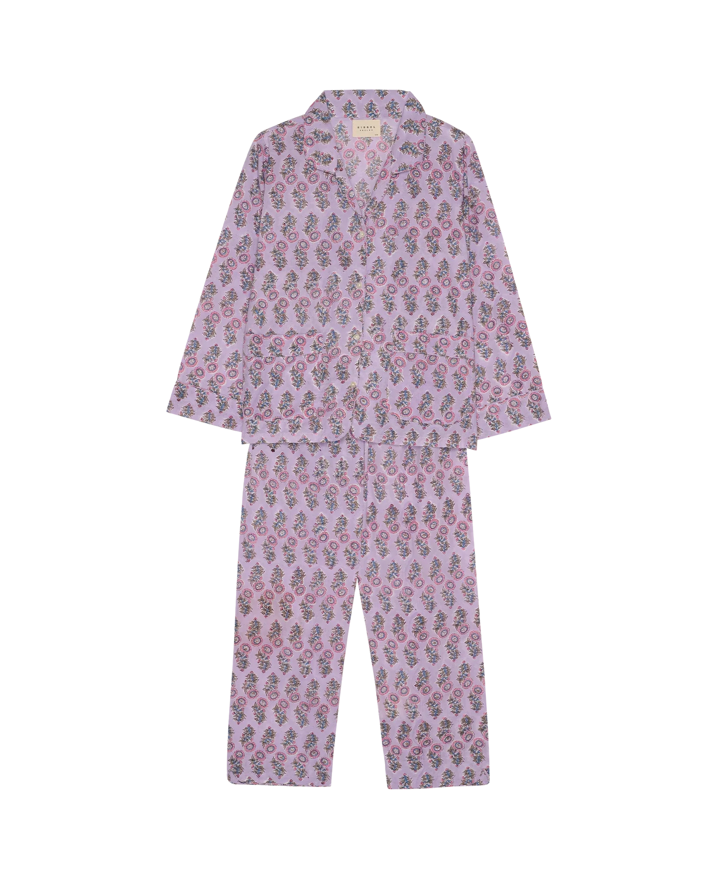 Ensemble pyjama de Sissel Edelbo en violet avec motif floral. La chemise a une fermeture à boutons et un petit col, et le pantalon a un élastique à la taille.