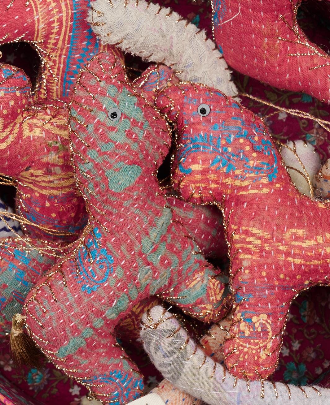 Ornement cheval à bascule de Sissel Edelbo, fabriqué à partir de chutes de couvertures kantha avec couture lurex dorée. L'ornement a un corps rouge avec des motifs bleus.