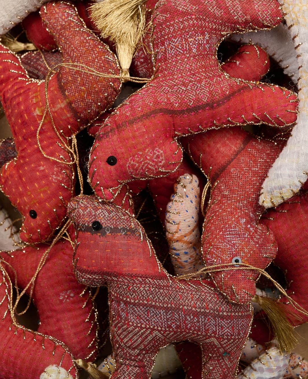 Ornement cheval à bascule de Sissel Edelbo, fabriqué à partir de chutes de couvertures kantha. Chaque cheval à bascule est fait à la main avec la technique de broderie kantha, qui réutilise de vieux saris en coton.