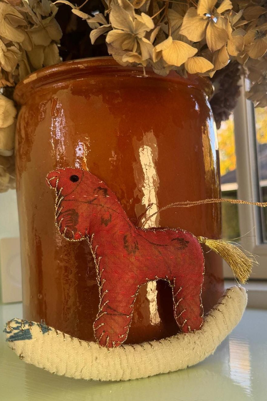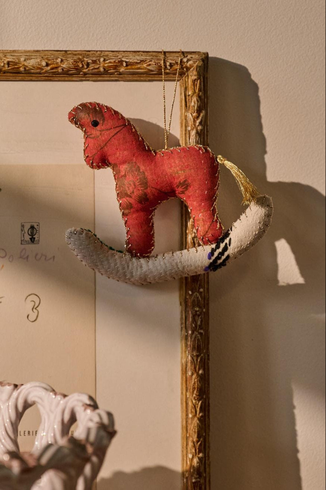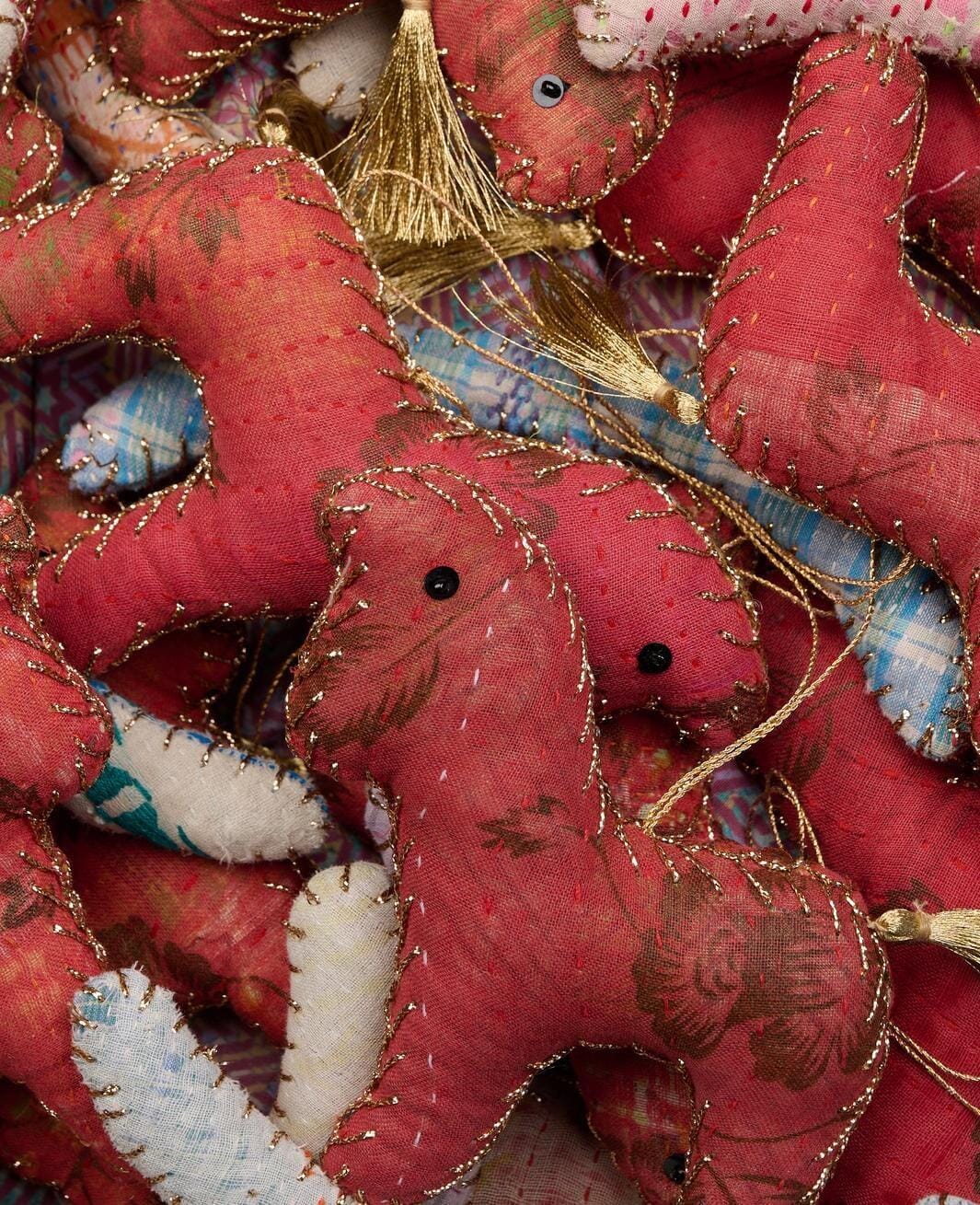 Ornement cheval à bascule de Sissel Edelbo, fabriqué à partir de chutes de couvertures kantha. Chaque ornement a un corps rouge avec un fond blanc et un pompon doré.