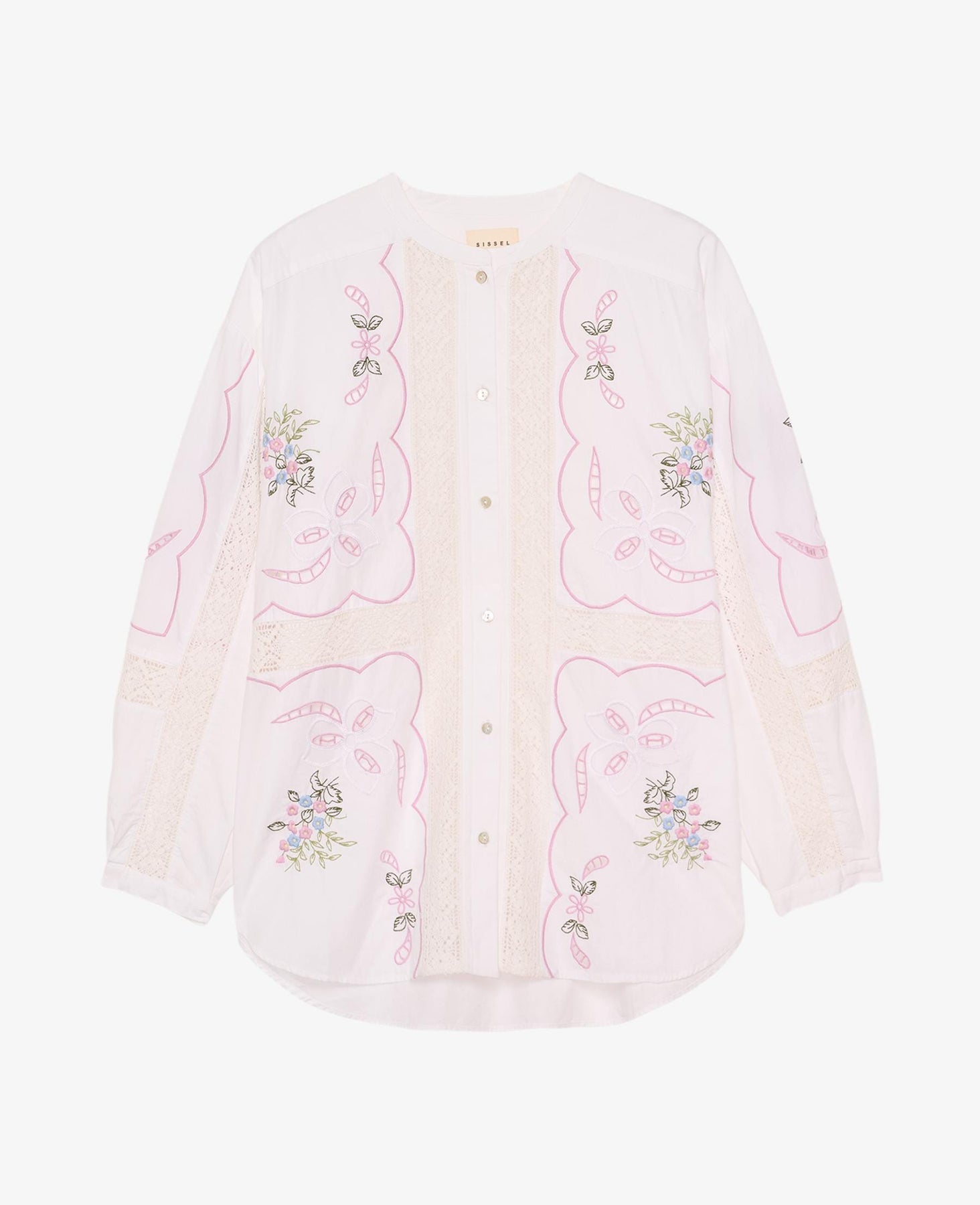 Chemise blanche de Sissel Edelbo avec motifs floraux brodés dans des tons pastel et détails en dentelle. La chemise présente une coupe ample et est fabriquée en coton biologique.