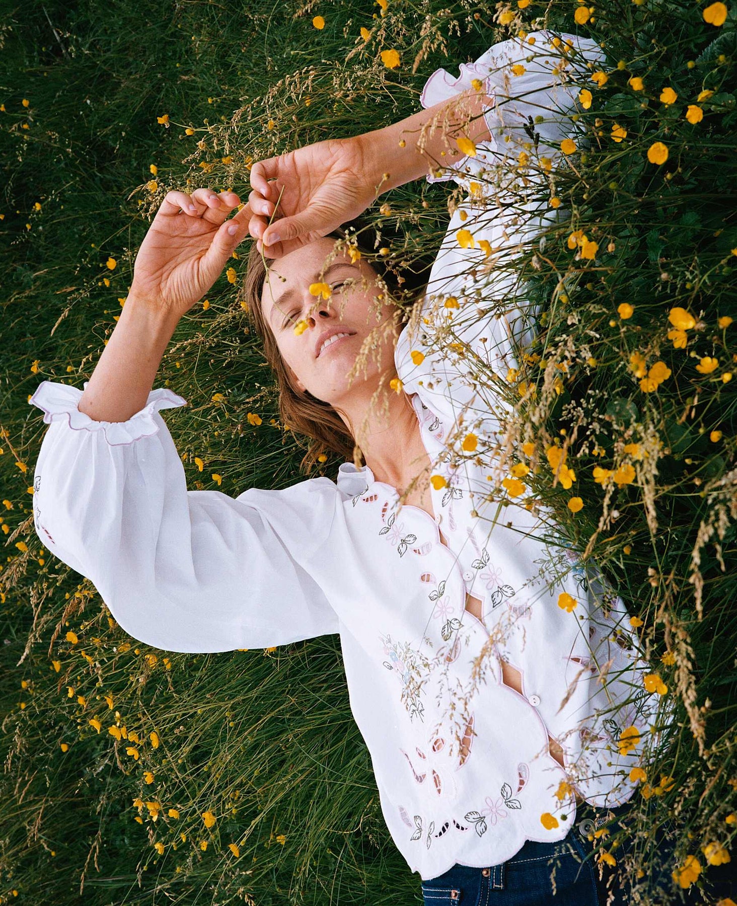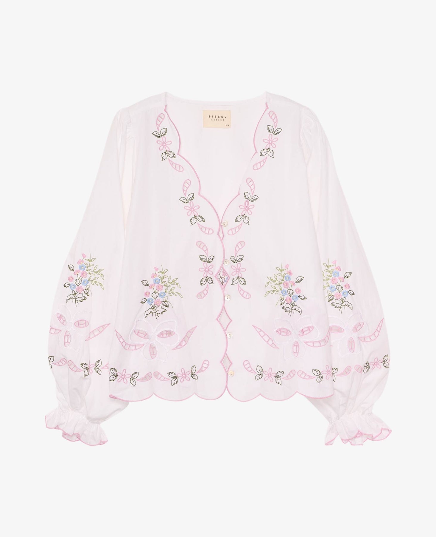 Haut blanc de Sissel Edelbo avec broderies florales pastel sur le devant et les manches. Le haut présente une coupe ample et des manches longues.