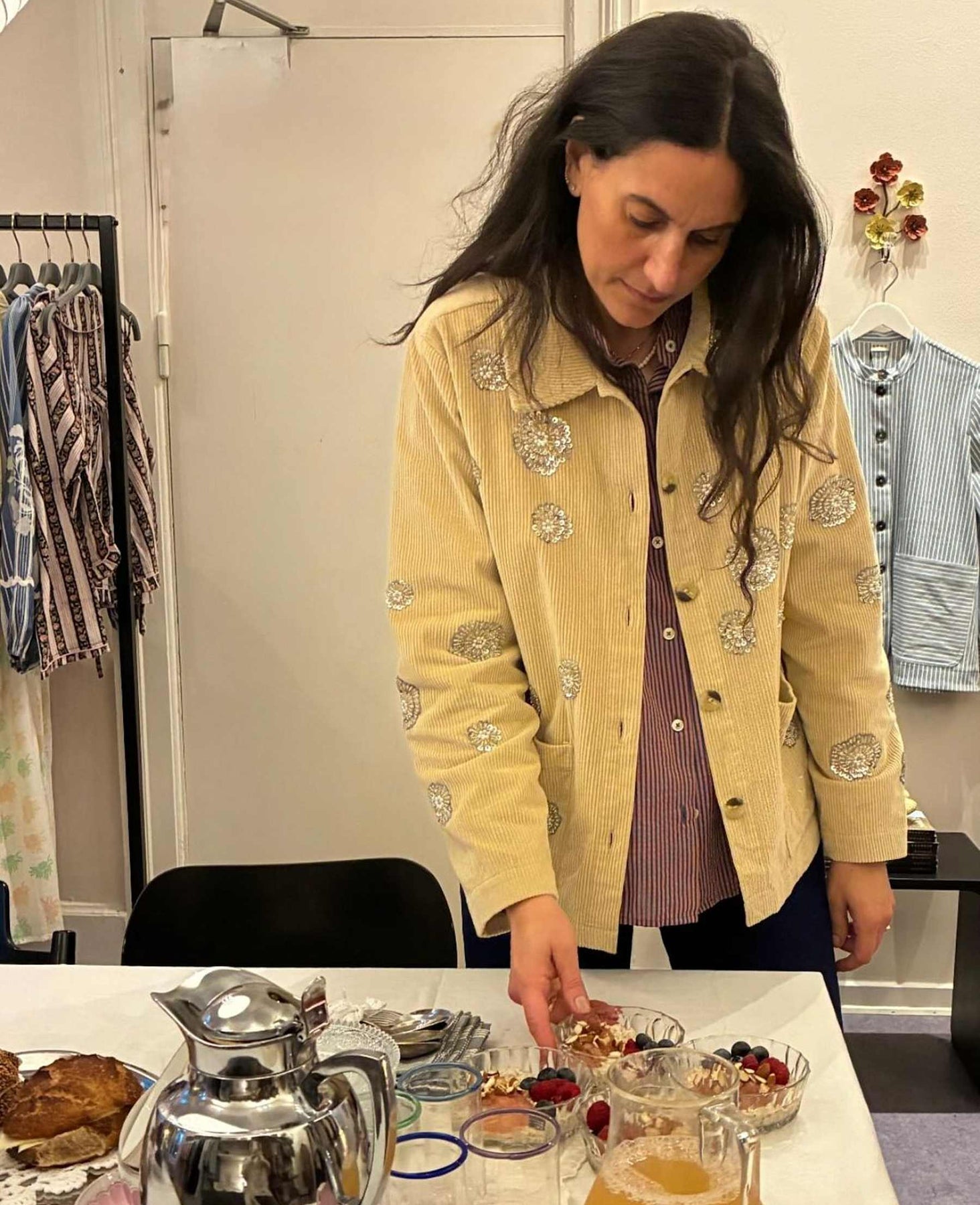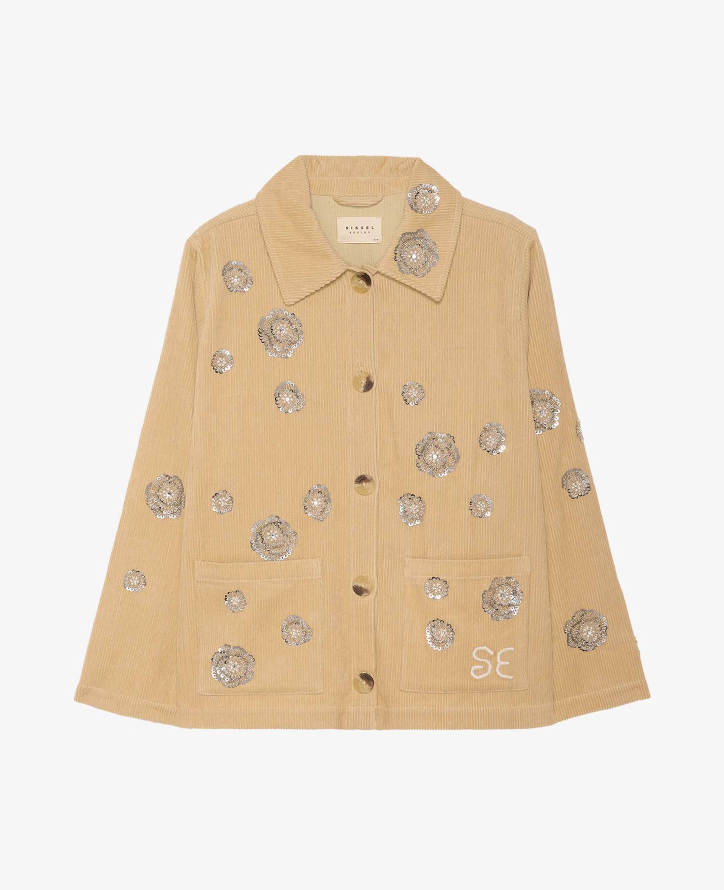 Veste beige de Sissel Edelbo, confectionnée à partir de velours côtelé excédentaire. La veste est ornée de sequins et de rosettes de perles de différentes tailles, disposés dans un motif irrégulier.
