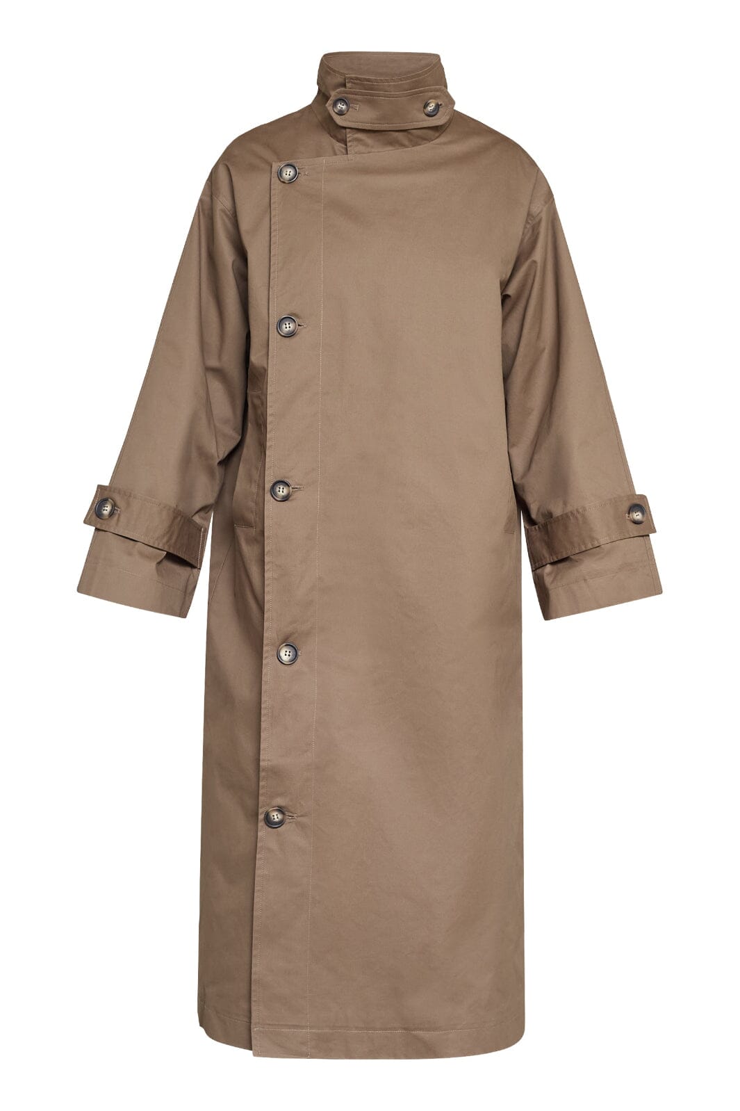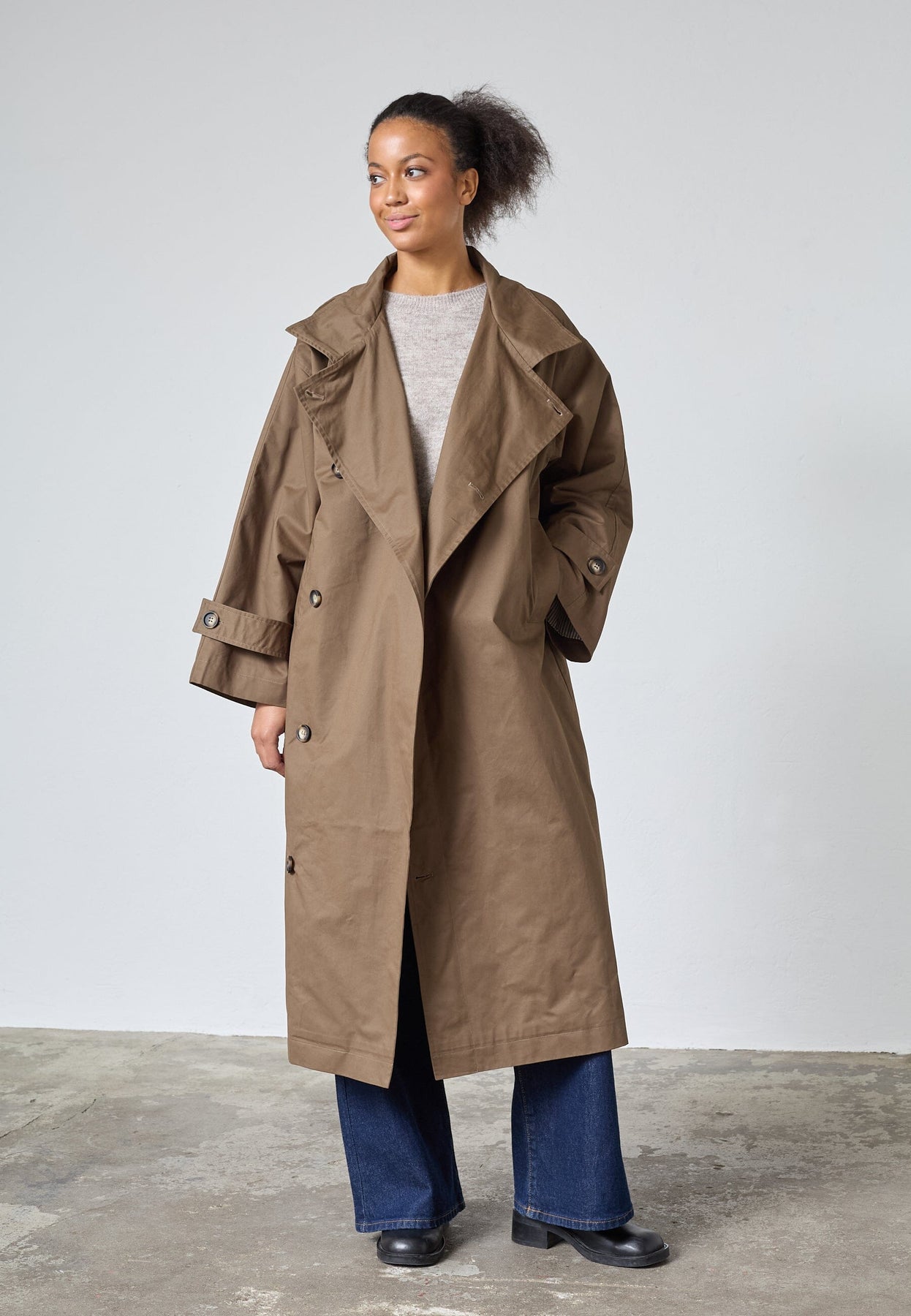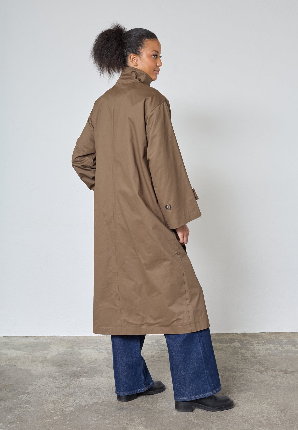 Long trench-coat oversize de Sisters Point dans une teinte brune. La veste est fabriquée en 100 % coton et possède une fermeture à boutons.