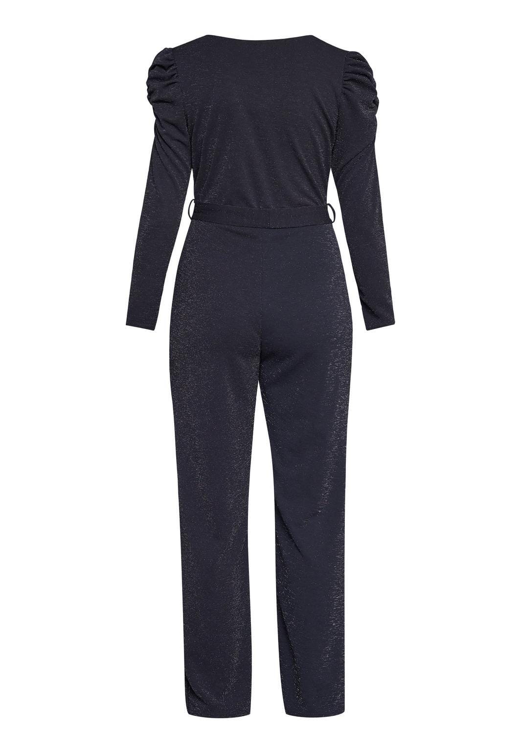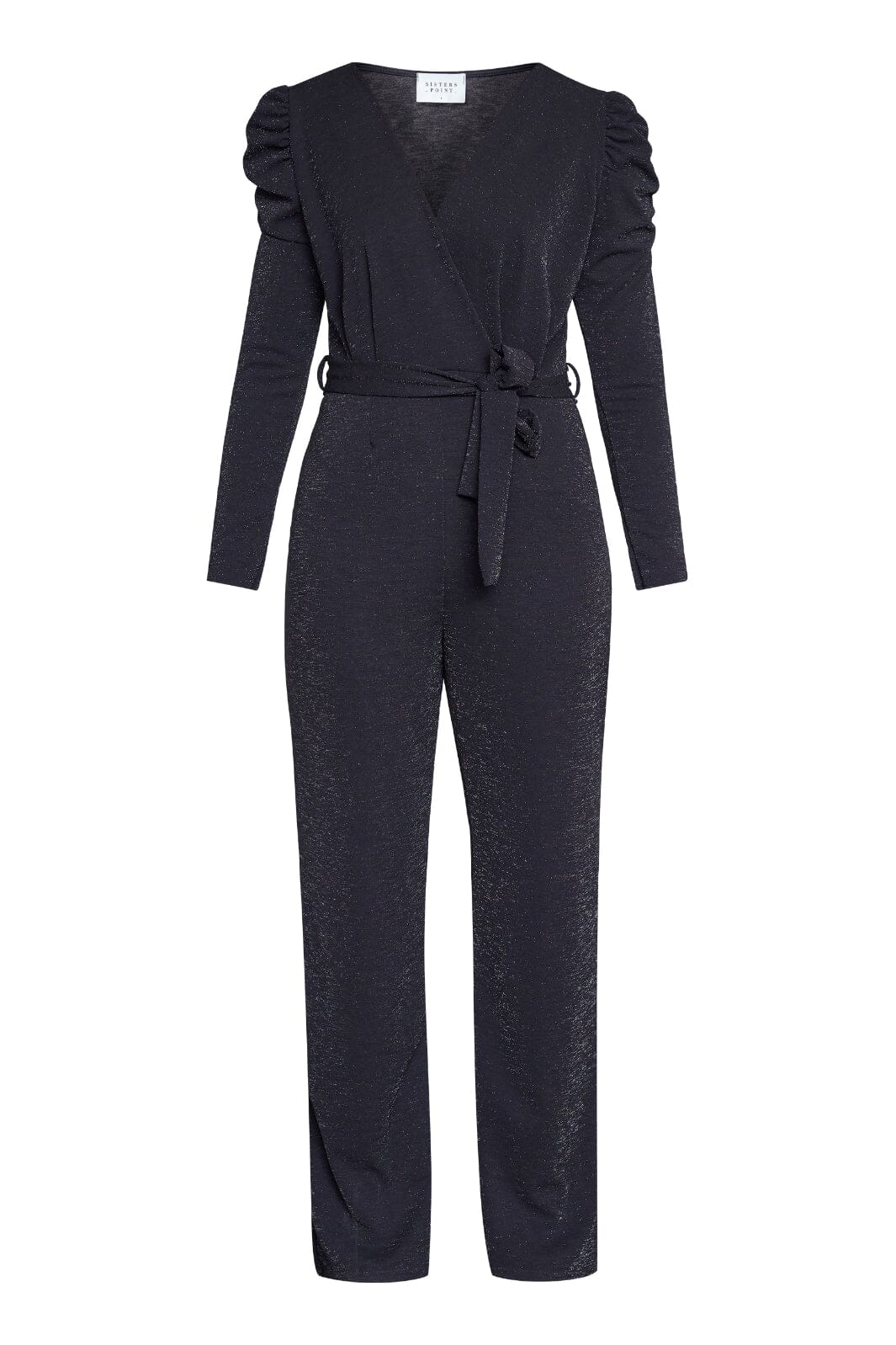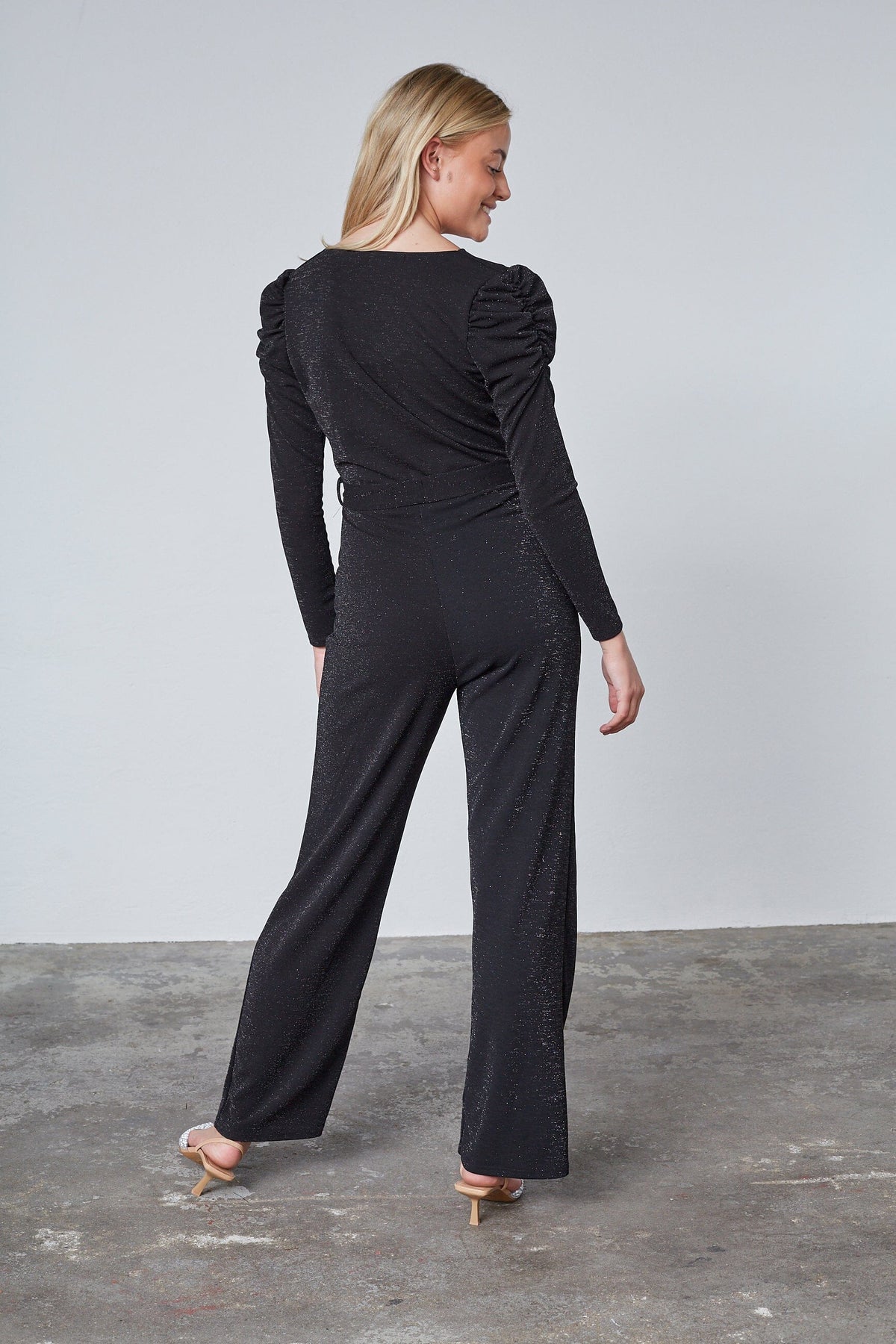 Combinaison noire de Sisters Point avec effet paillettes argentées. Elle a un décolleté en V, des manches bouffantes avec des détails froncés aux épaules et un lien à nouer à la taille.