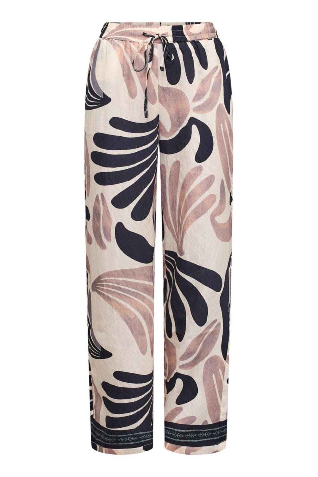 Pantalon Sisters Point avec un imprimé abstrait dans des tons bruns, beiges et noirs. Le pantalon présente une coupe à jambes larges et une coupe ample.