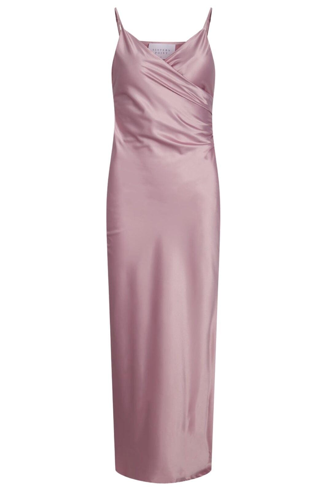 Robe de fête rose de Sisters Point avec décolleté en V drapé et fines bretelles. La robe a une coupe près du corps et descend jusqu'aux chevilles.