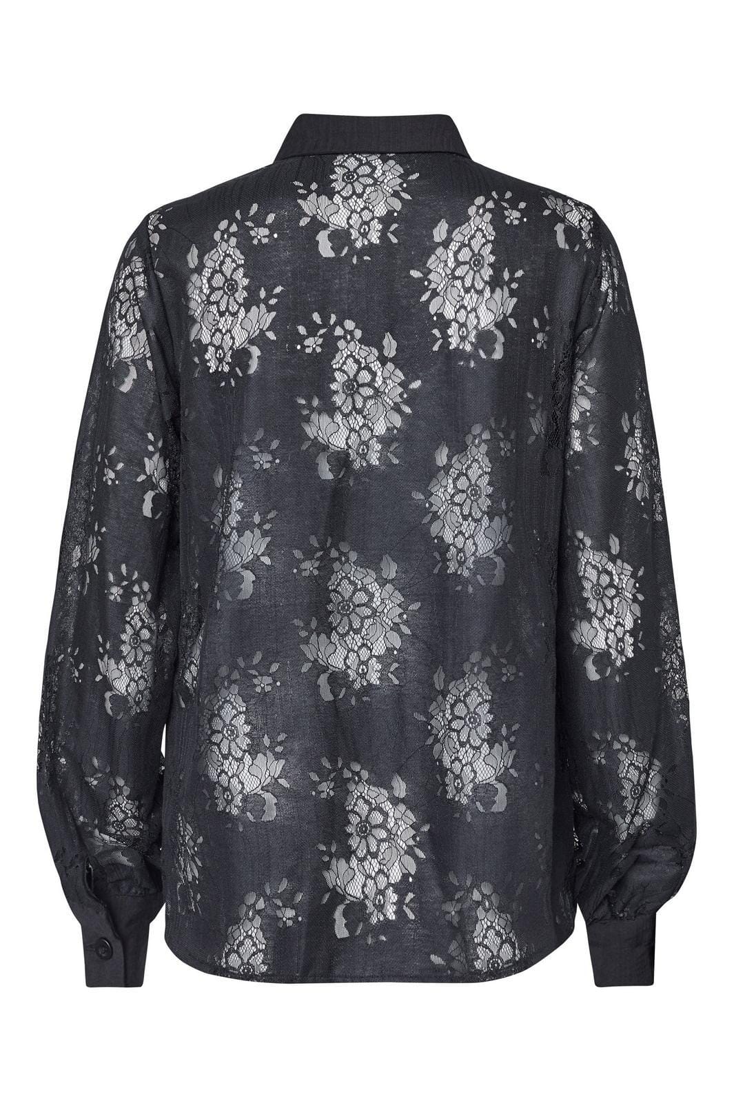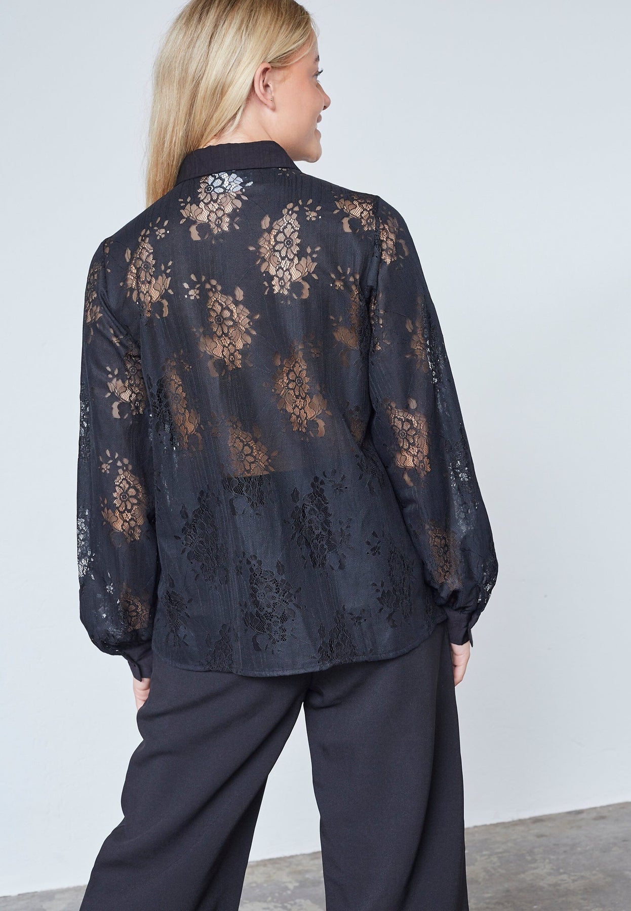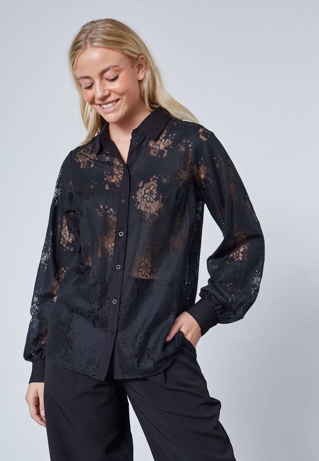 Chemise noire de Sisters Point avec motif floral transparent en dentelle. La chemise a une coupe ample avec un col classique et une fermeture à boutons à l'avant. Les longues manches se terminent par des poignets.
