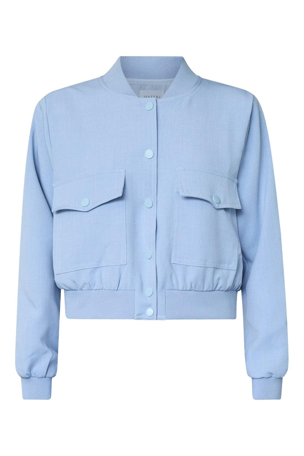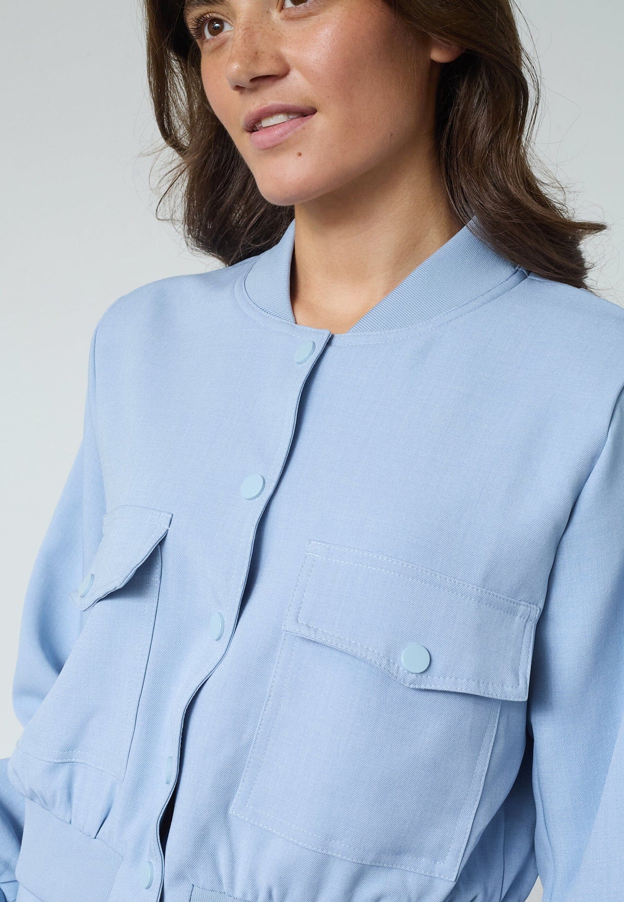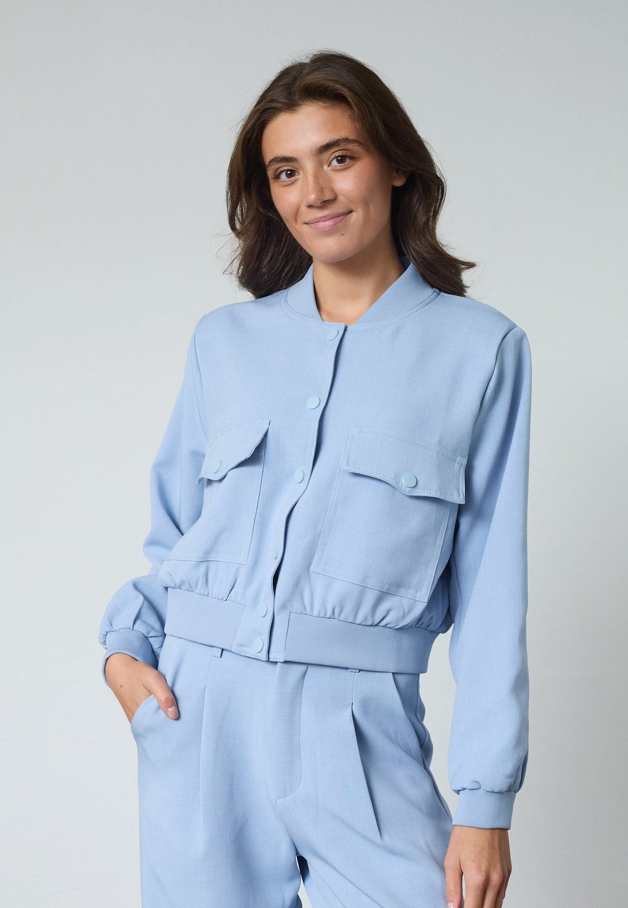 Veste bleu clair de Sisters Point, fabriquée en polyester avec élasthanne. La veste a une coupe courte et convient aux occasions décontractées.