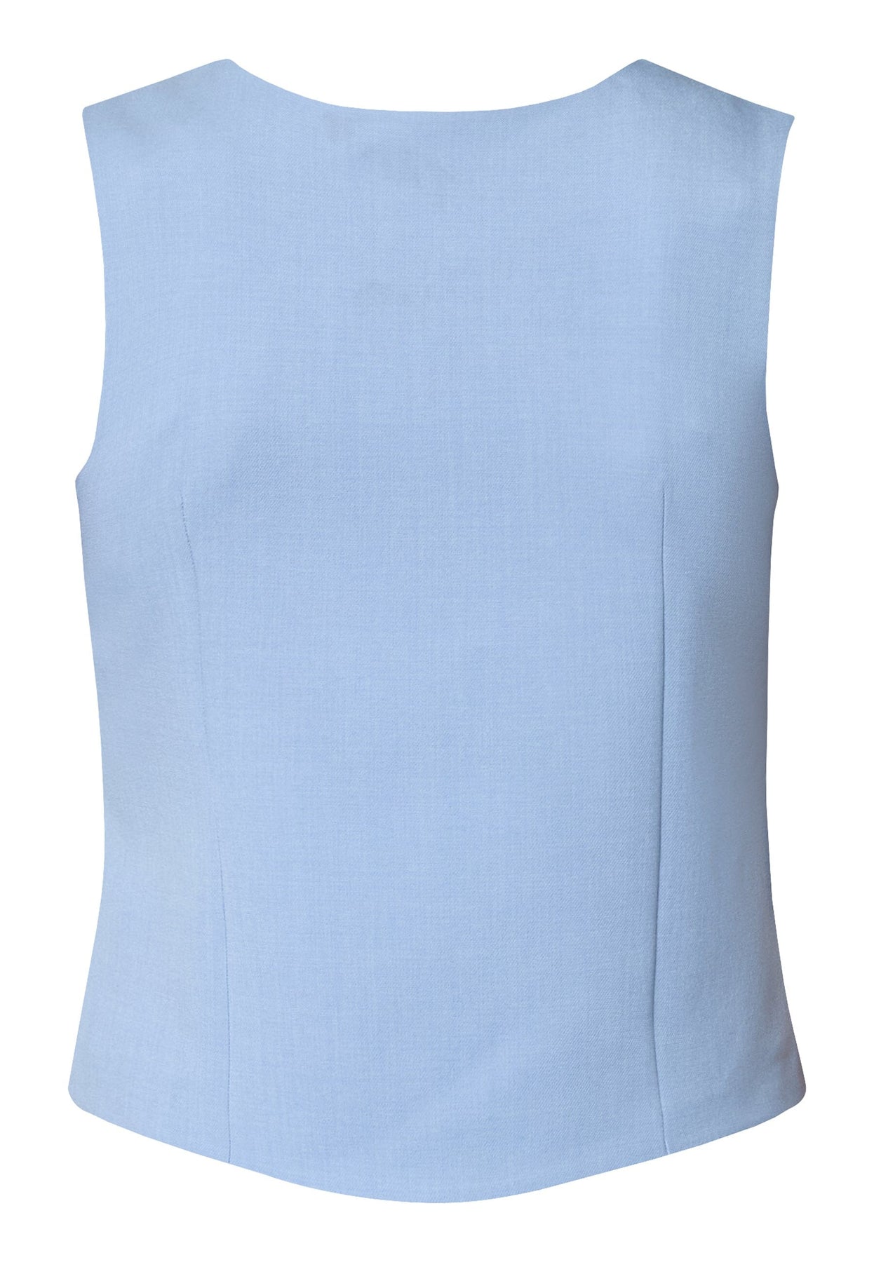 Un gilet bleu clair de Sisters Point avec fermeture asymétrique à boutons et encolure en V. Le gilet possède six boutons sur le devant et deux poches décoratives.