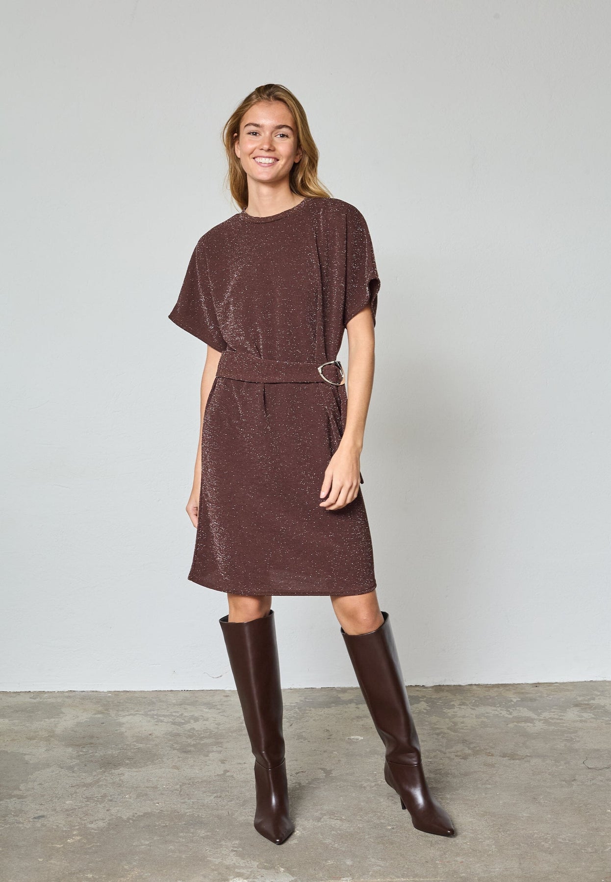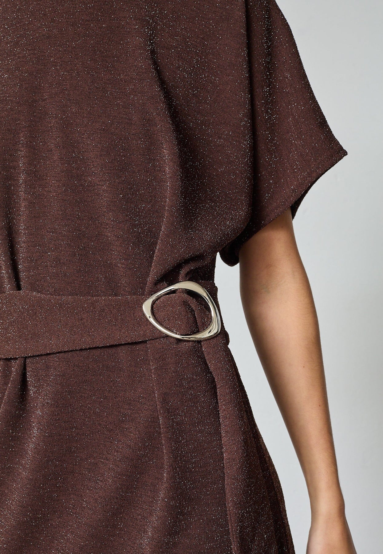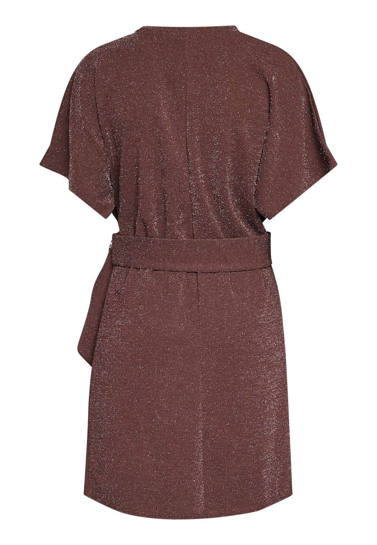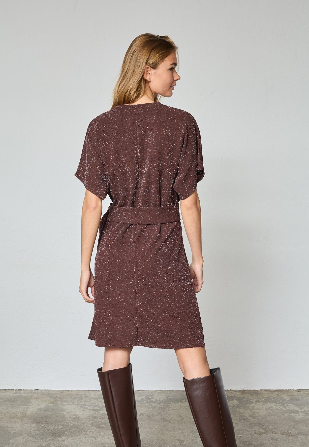 Robe marron de Sisters Point avec une surface structurée, où des fils argentés brillants donnent à la robe une allure festive.