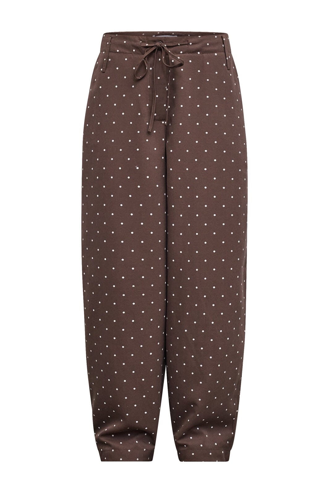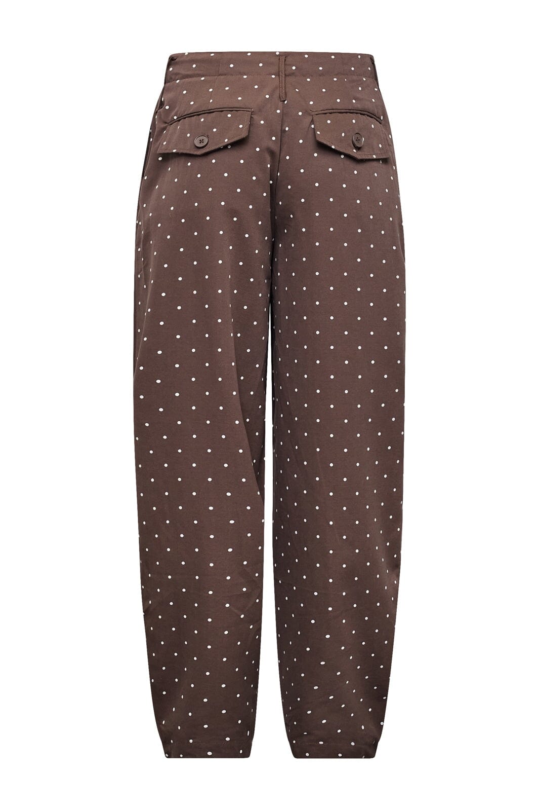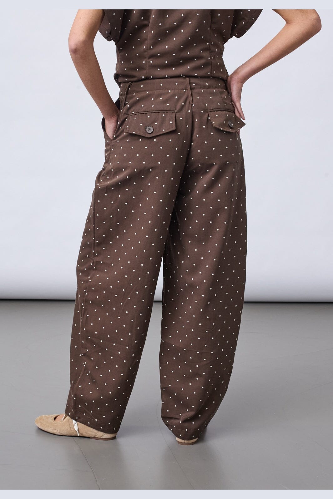 Pantalon marron de Sisters Point à pois blancs. Le pantalon a une taille haute et une coupe ample qui arrive aux chevilles.