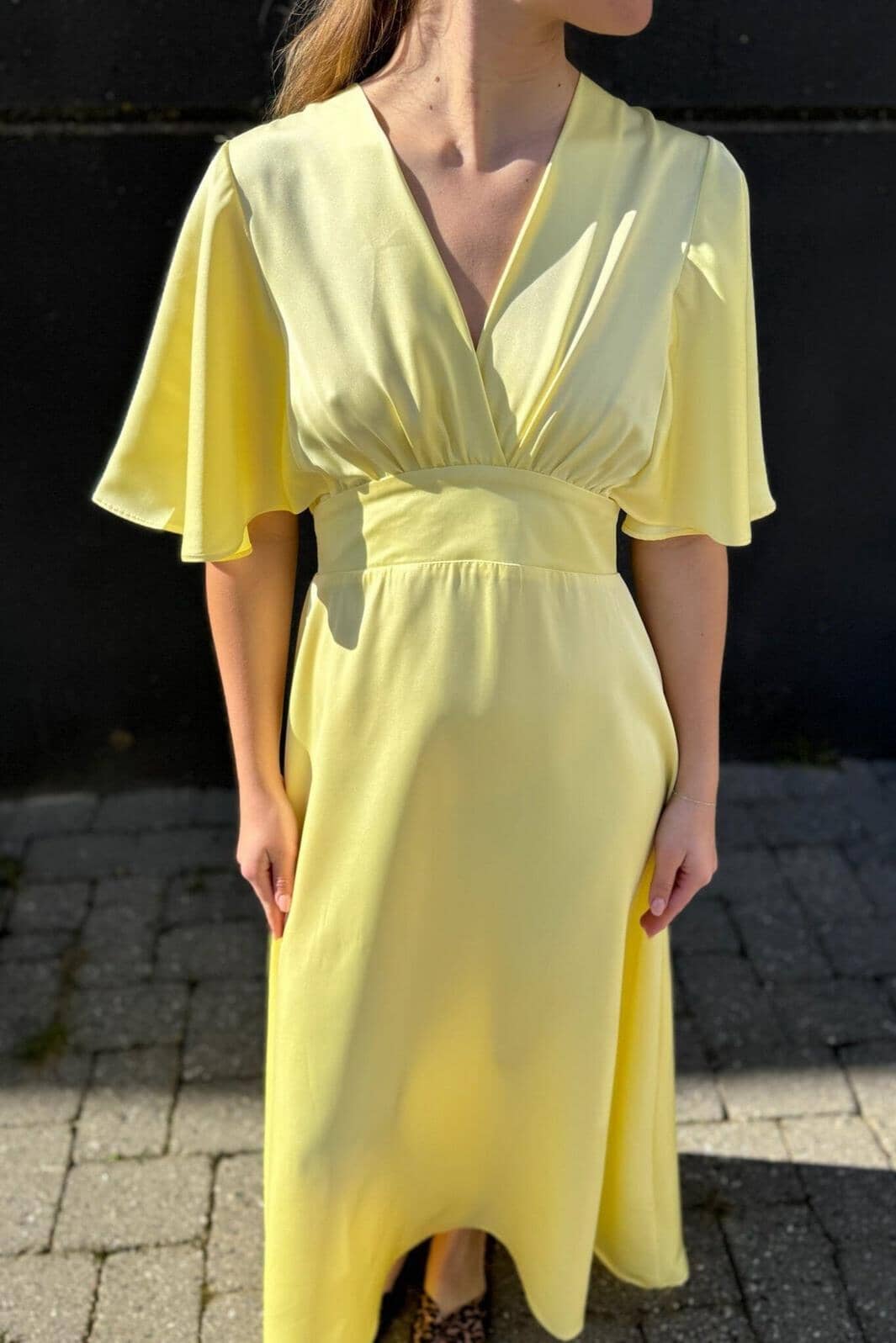 Robe jaune clair de Sisters Point avec des détails smock au dos. La robe a un décolleté en V profond et des manches volantées amples. Les détails smock offrent un bon ajustement au niveau de la taille.
