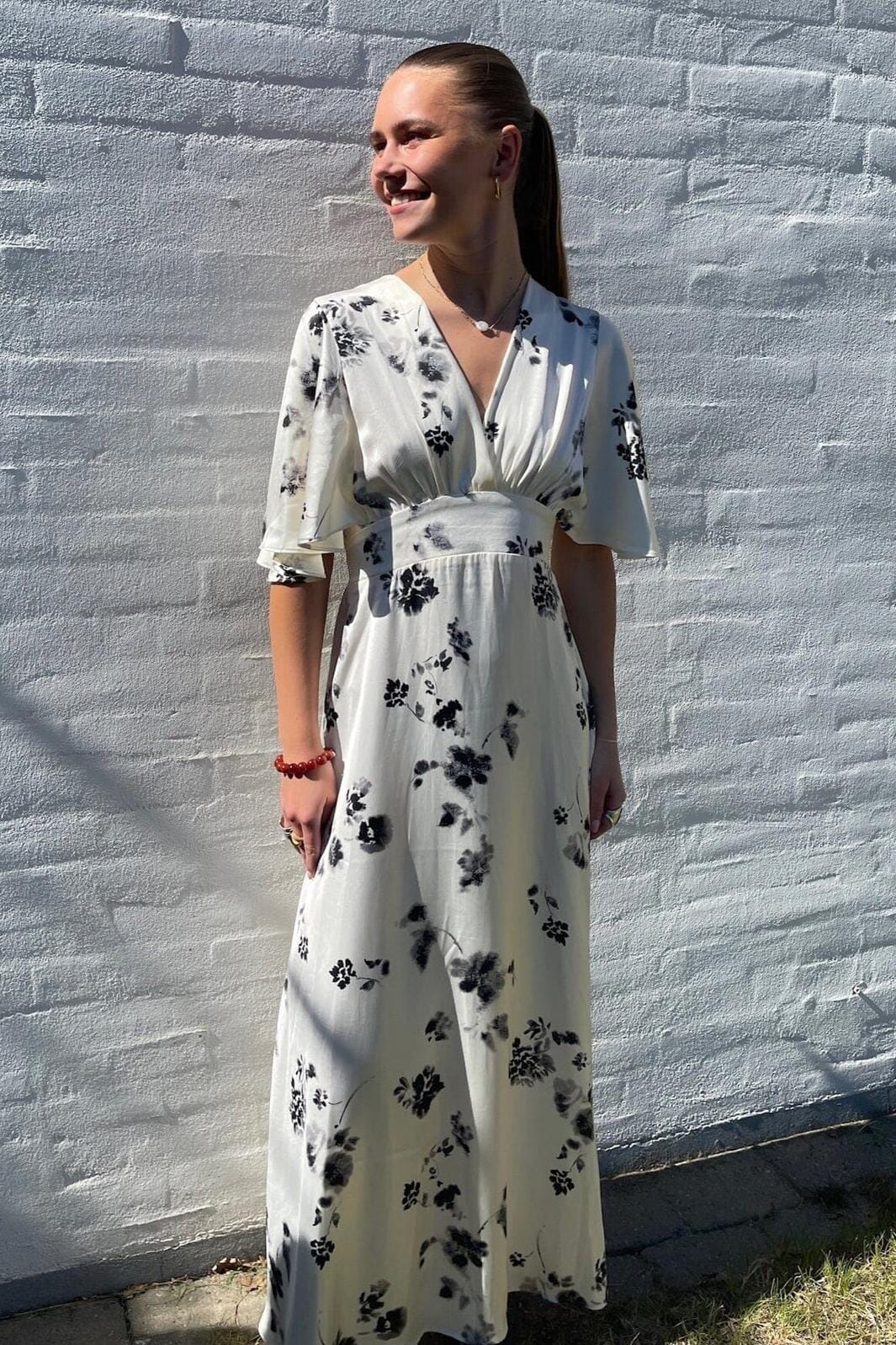 Robe longue jusqu'à la cheville de Sisters Point en crème avec des fleurs noires. La robe a un décolleté en V et des manches courtes en volants. La taille smockée offre un bon ajustement.
