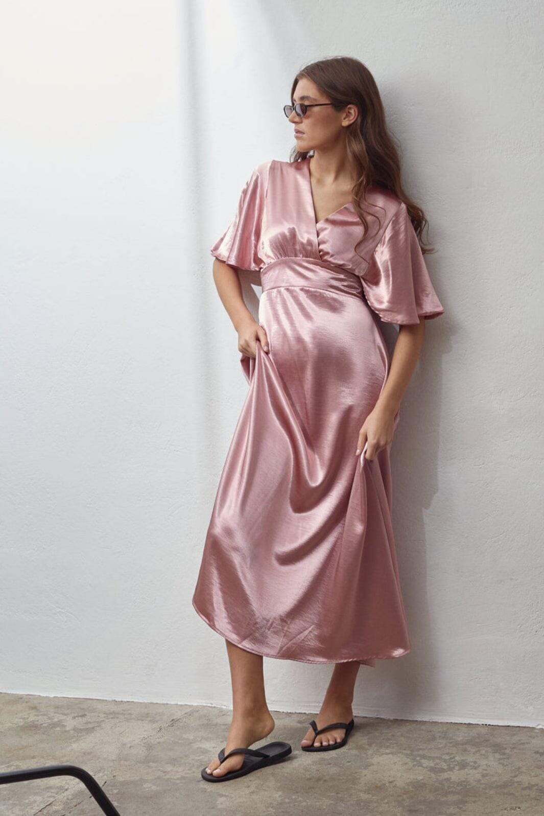 Robe longue de Sisters Point, violette avec une surface brillante. La robe possède un décolleté en V avec effet portefeuille et de courtes manches chauve-souris.