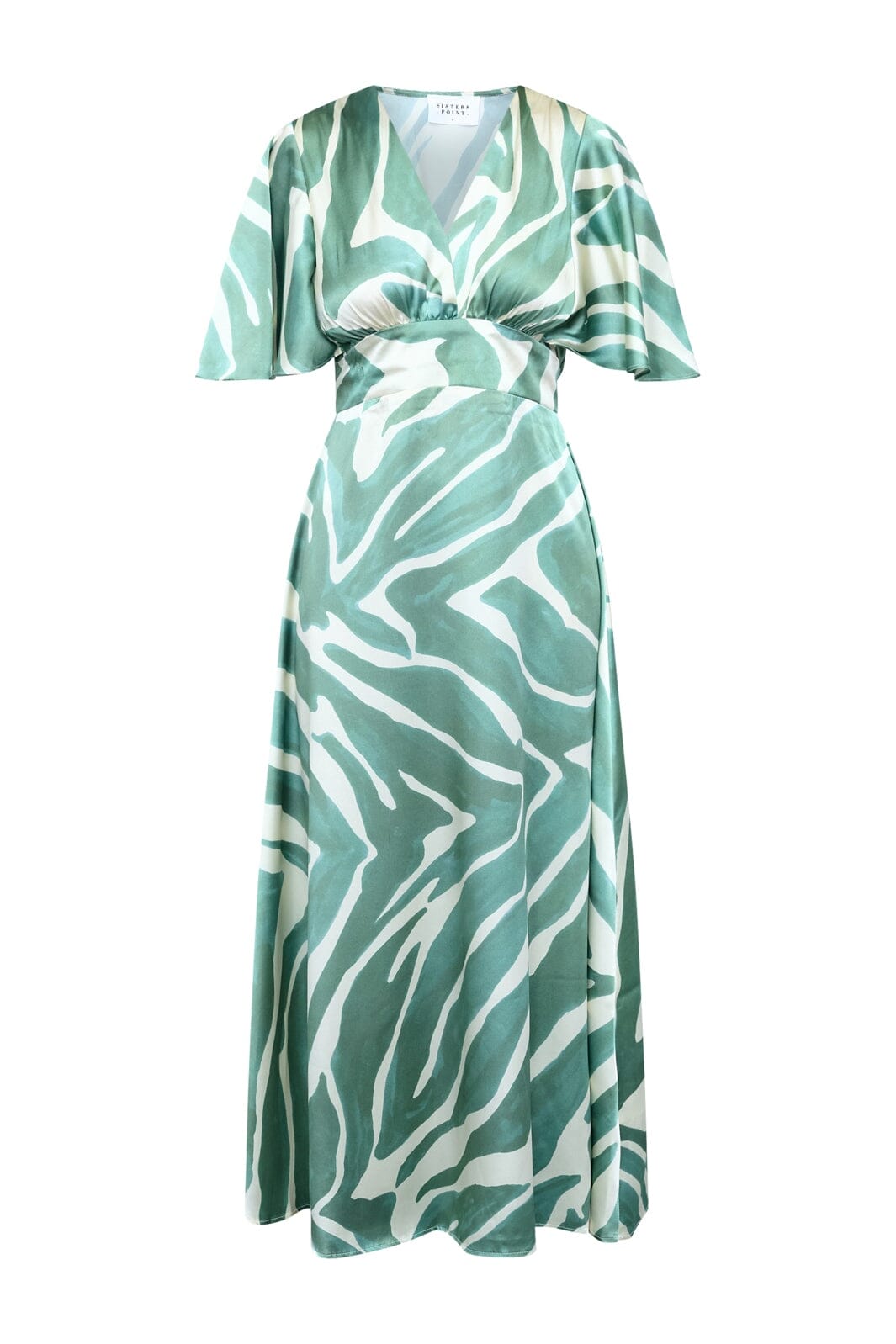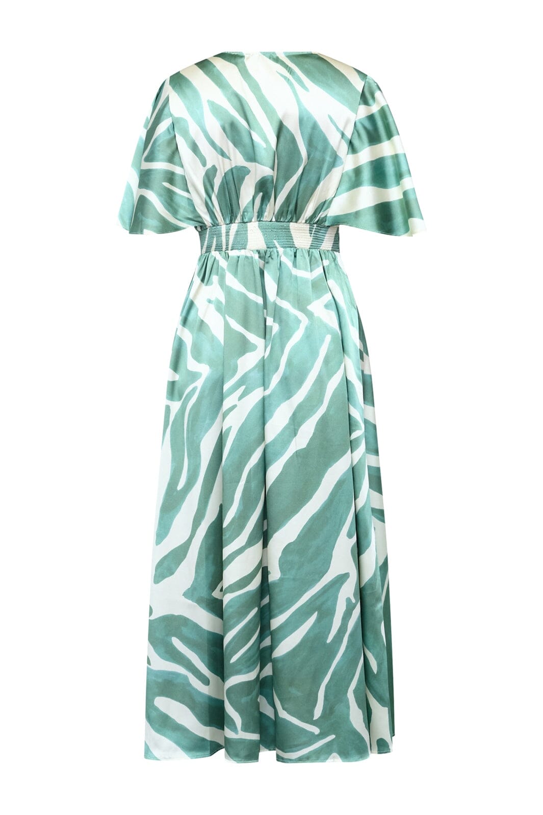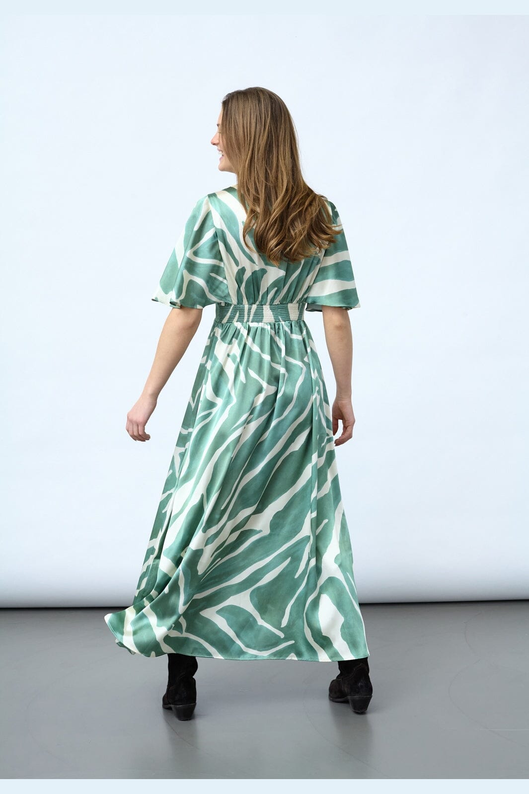 Robe Sisters Point avec un motif graphique vert et blanc. La robe est longueur cheville, à manches courtes et avec un col en V.