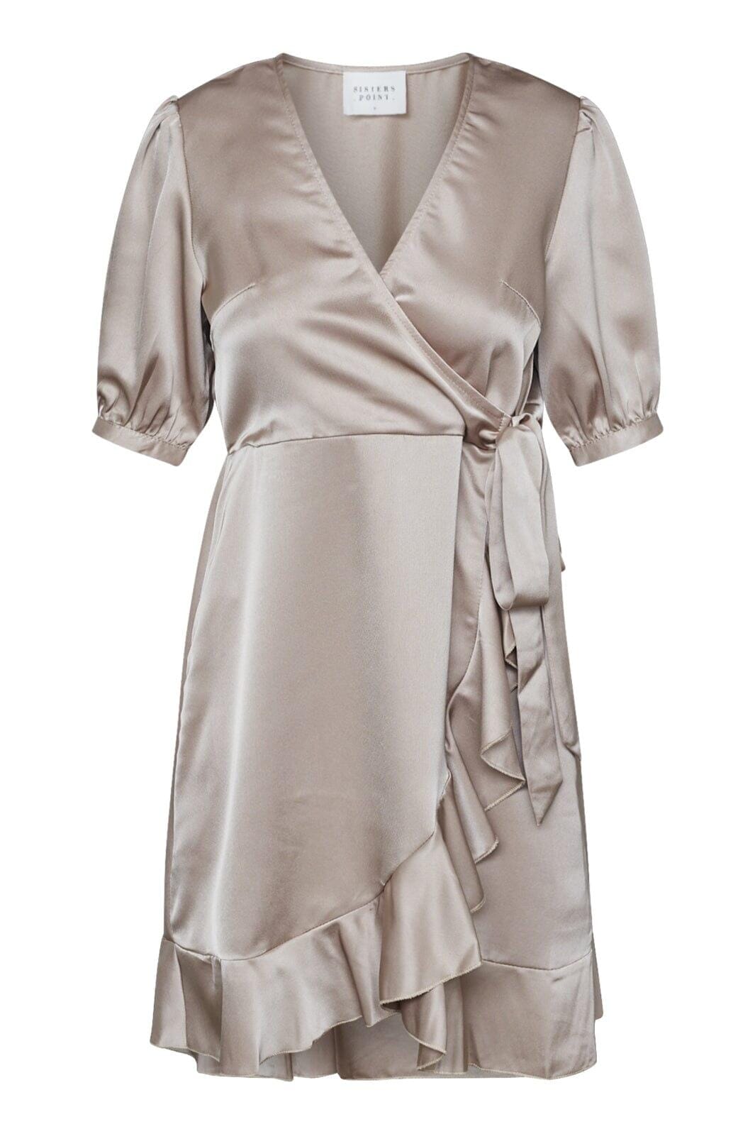 Robe portefeuille de Sisters Point en tissu satiné couleur champagne. La robe a des manches bouffantes, un volant en bas et un lien sur le côté qui crée une belle silhouette.