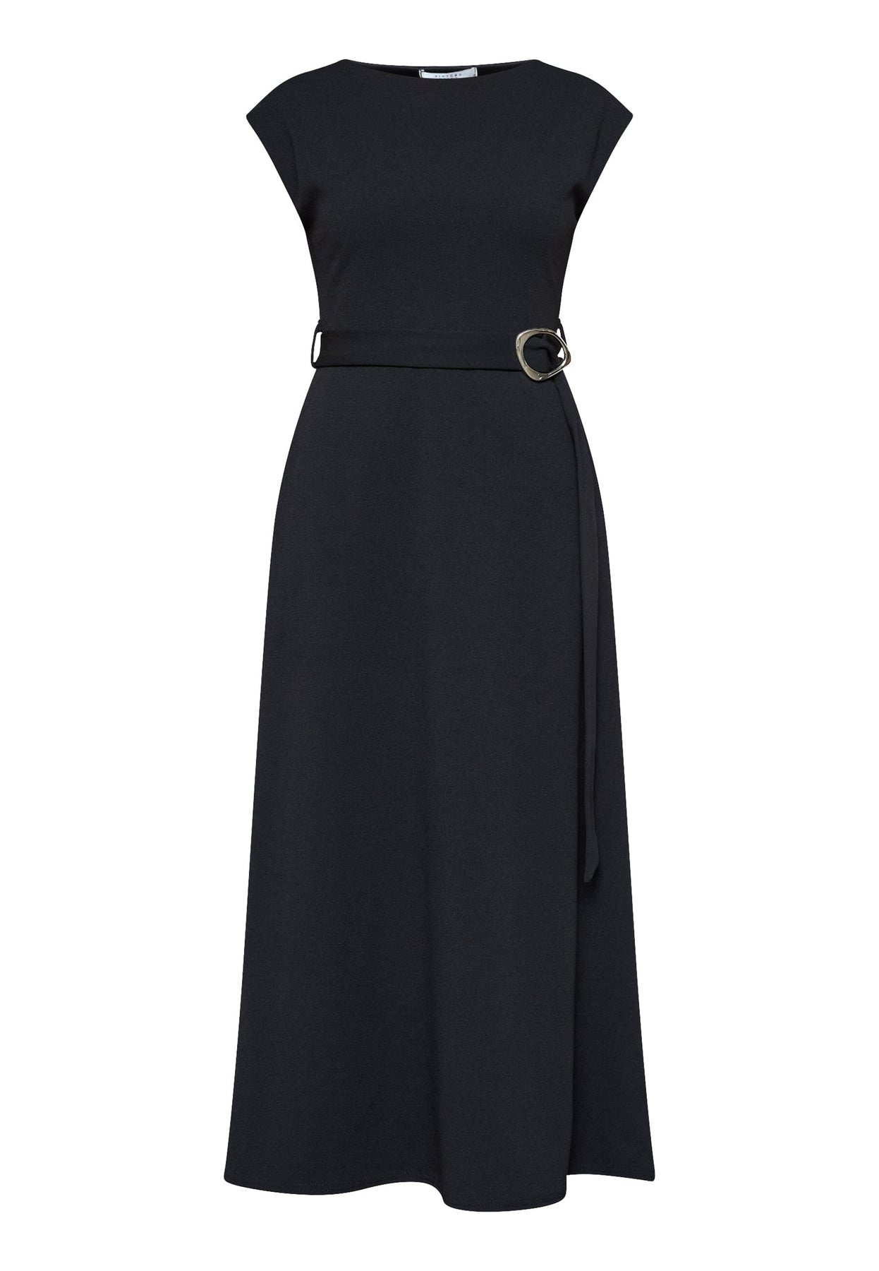 Robe noire de Sisters Point en polyester lisse avec ceinture de taille fixe et grande boucle ronde sur le devant.