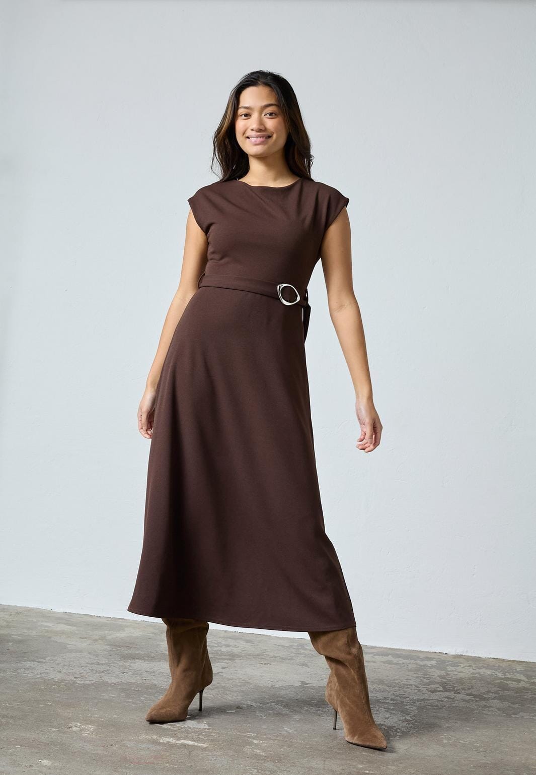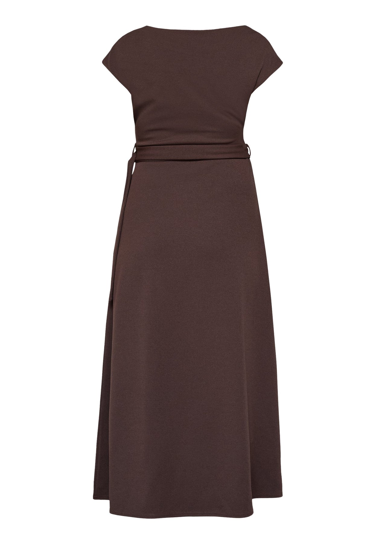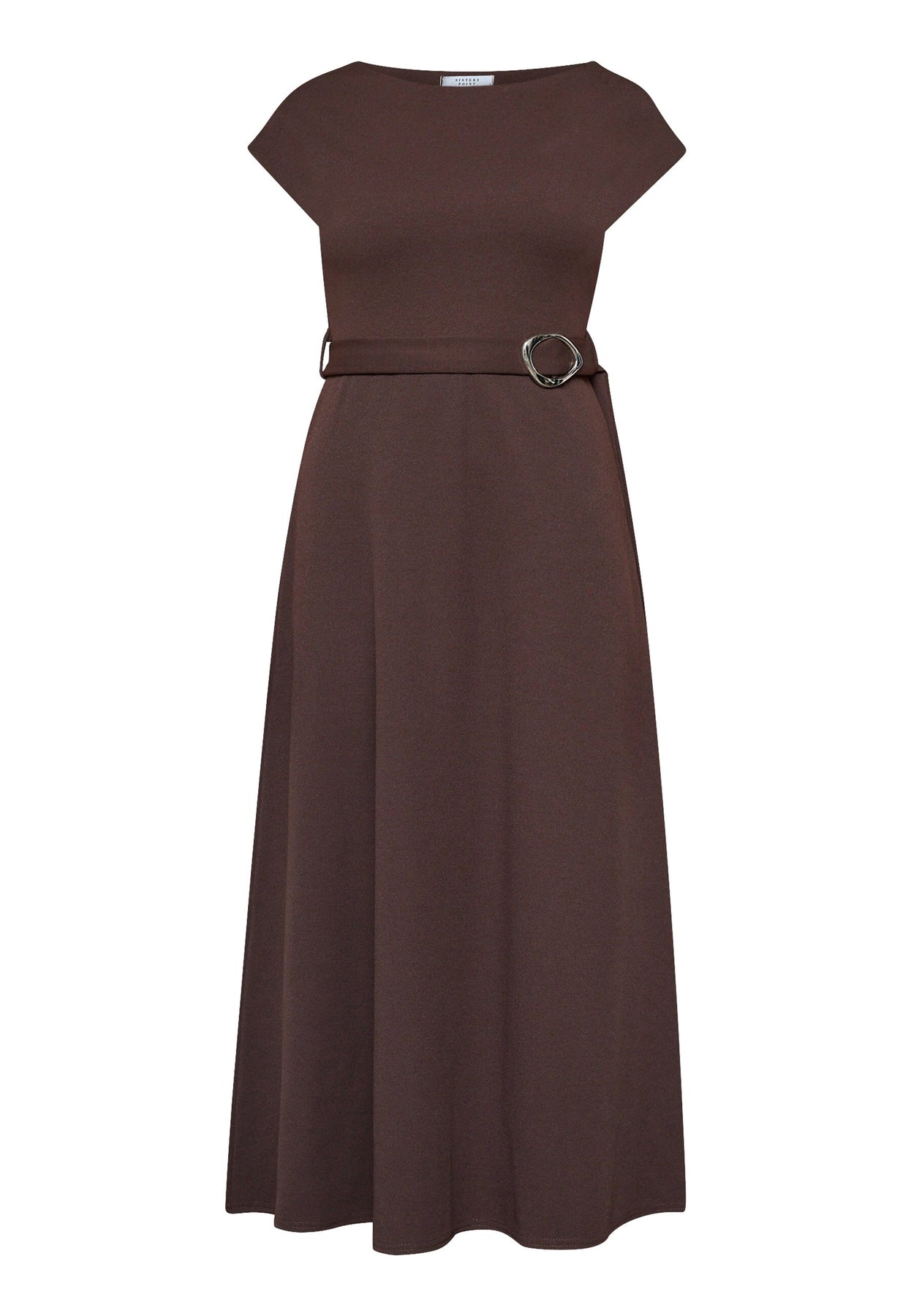 Robe mi-longue de Sisters Point dans une profonde couleur brun chocolat. La robe est confectionnée en polyester lisse, qui tombe lourdement et offre une silhouette structurée.