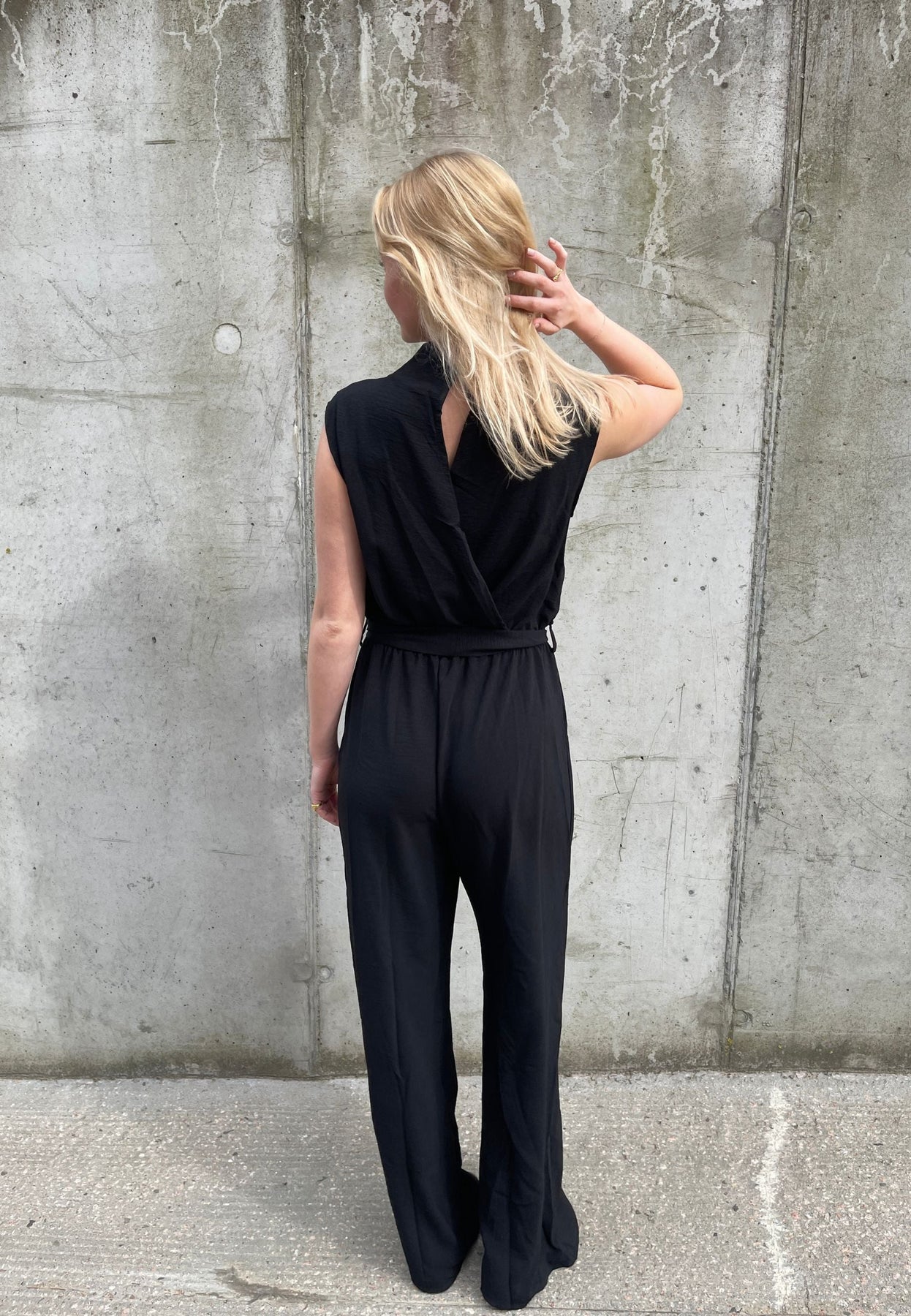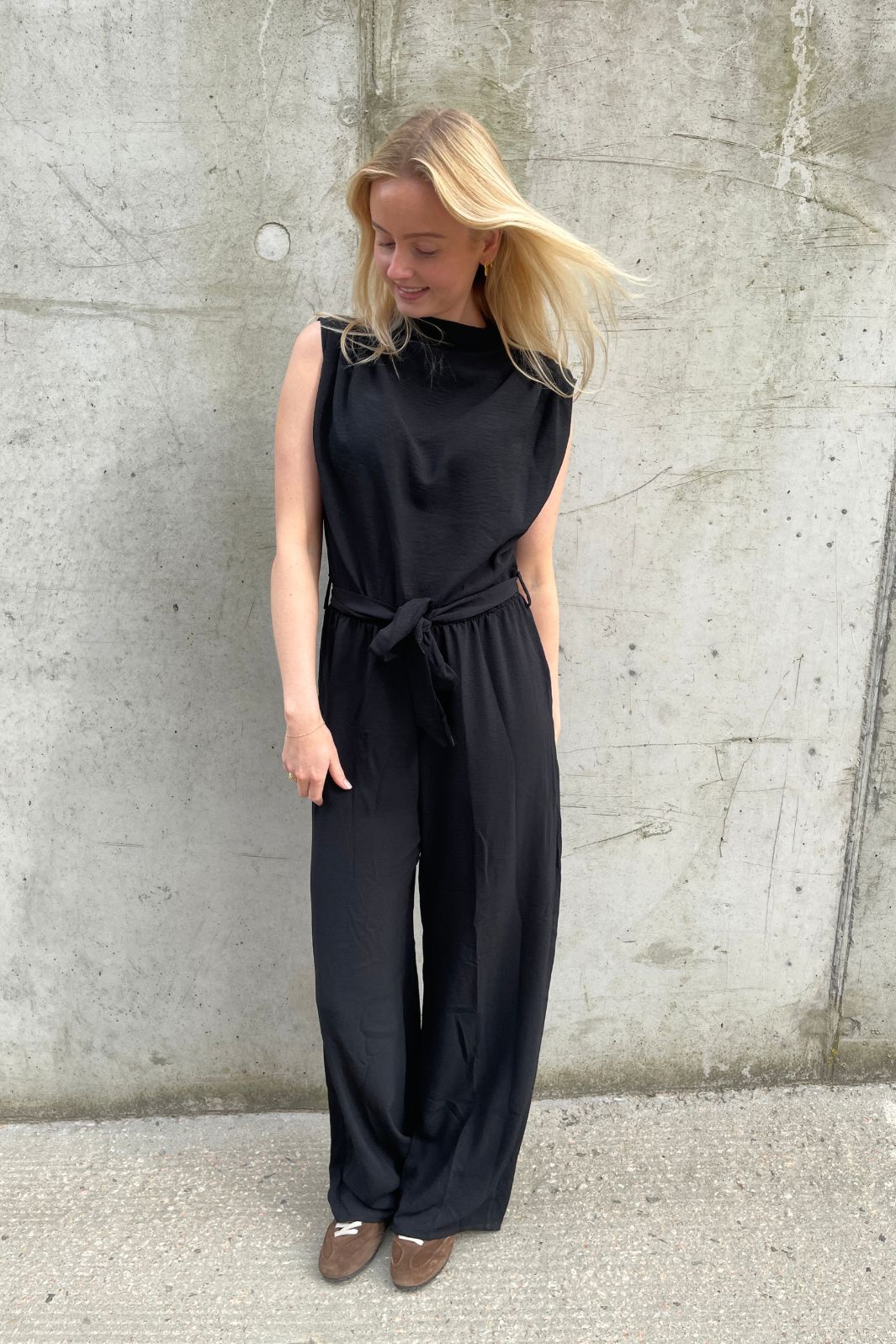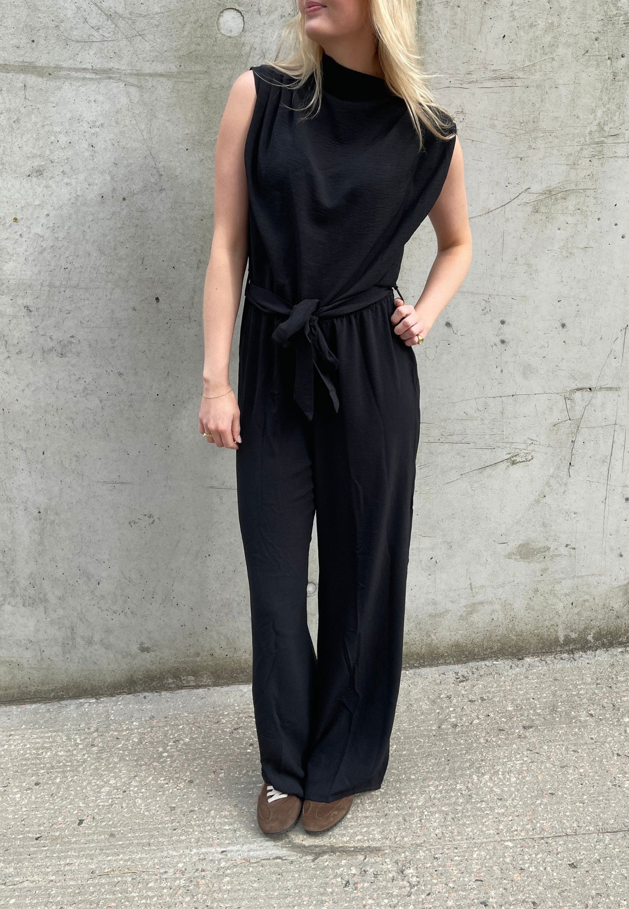 Combinaison noire de Sisters Point avec une longueur au sol et un col haut. La combinaison a un design sans manches et une ceinture à nouer à la taille, qui peut être ajustée selon vos souhaits.