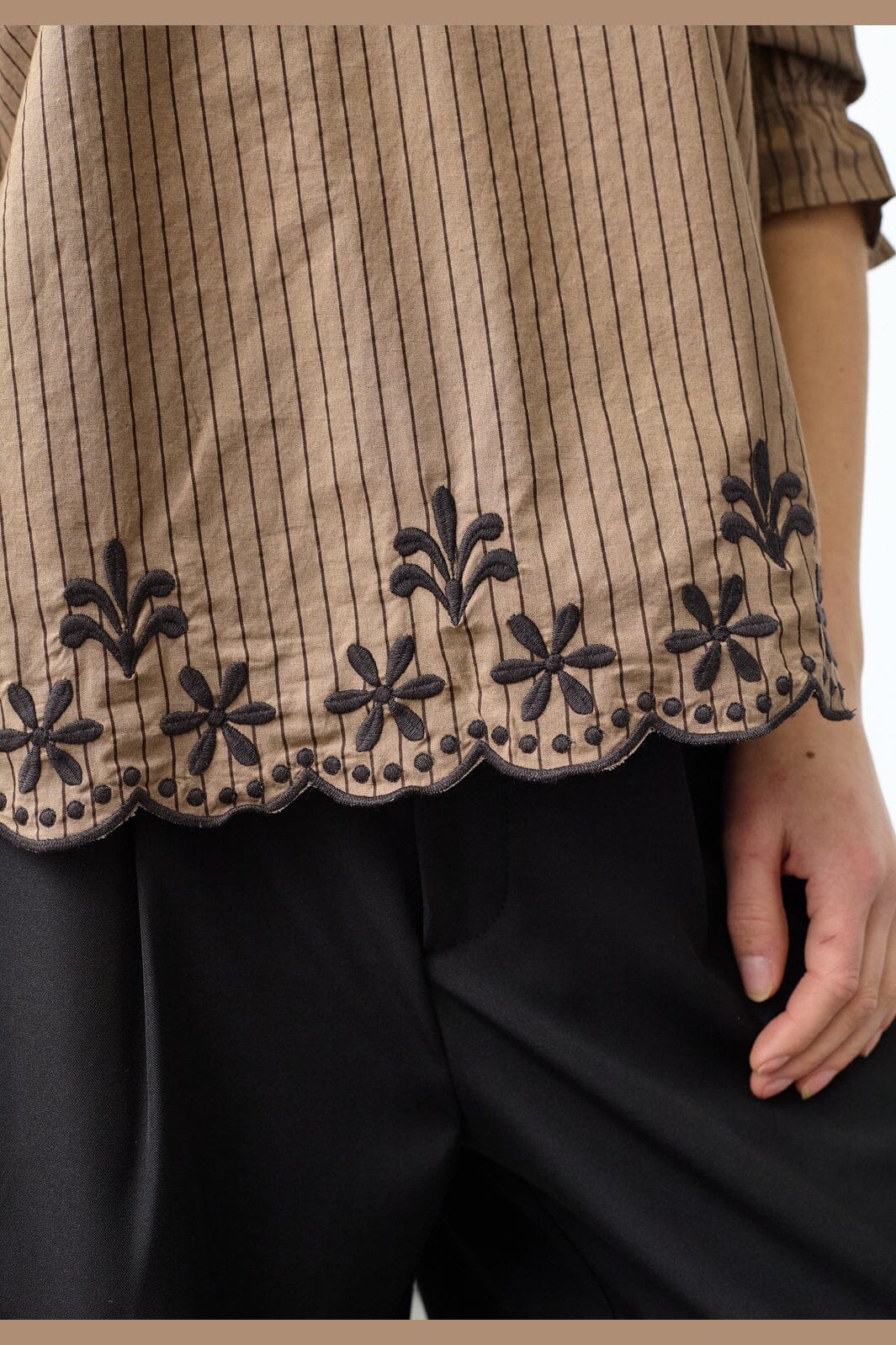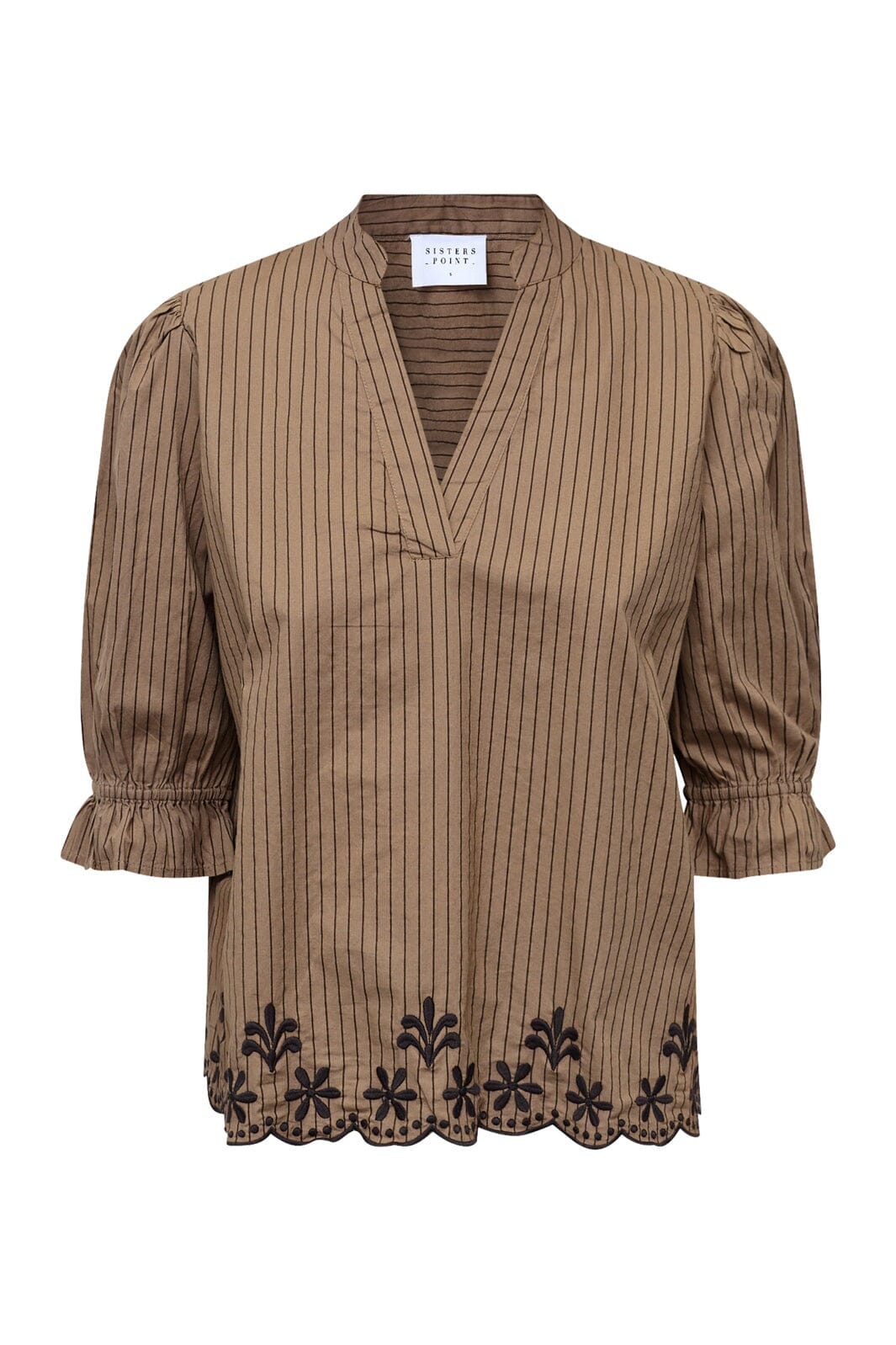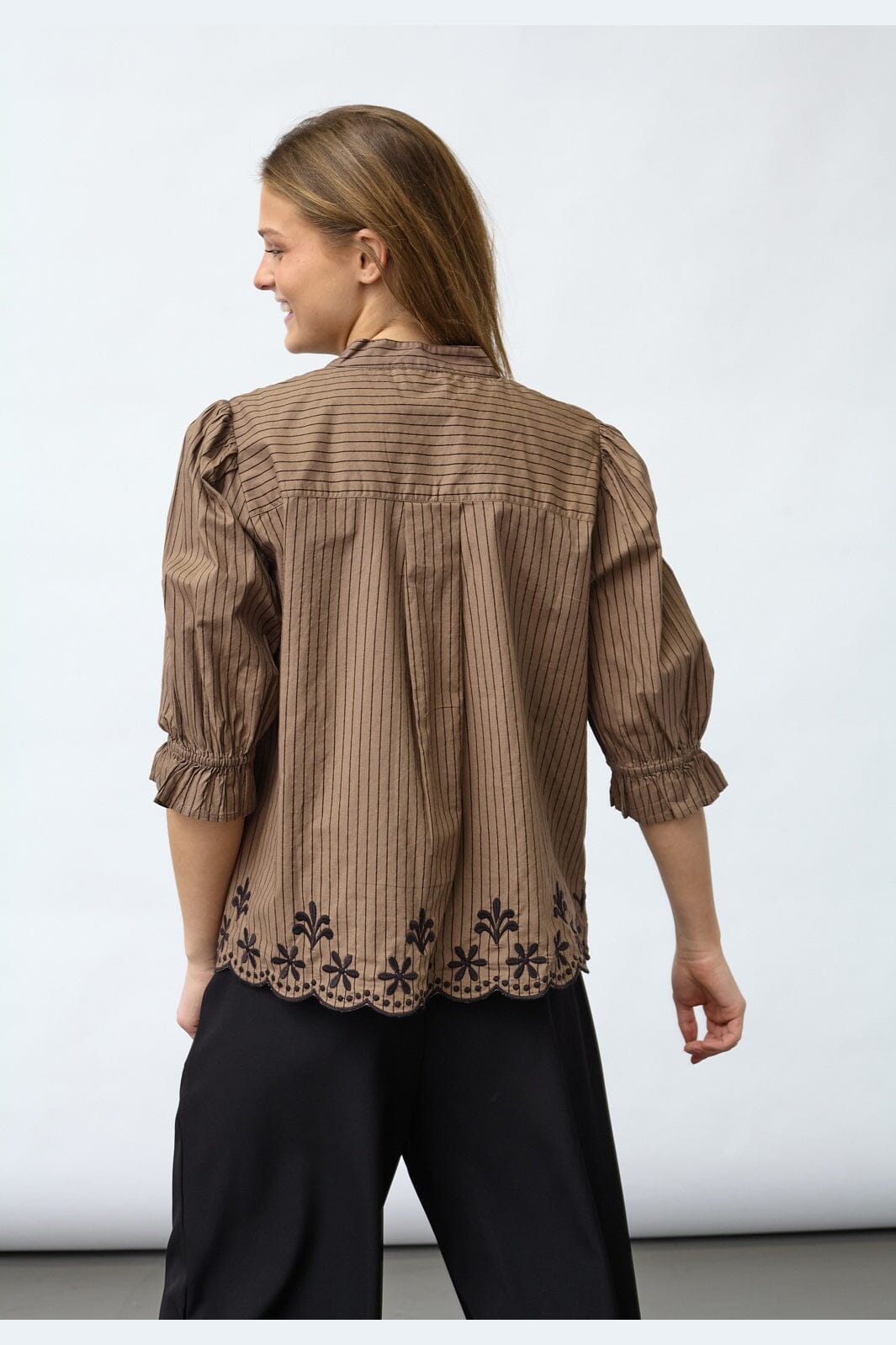 Blouse Sisters Point à rayures verticales brunes et coupe ample. La blouse possède des manches trois-quarts et un col en V avec petit col.