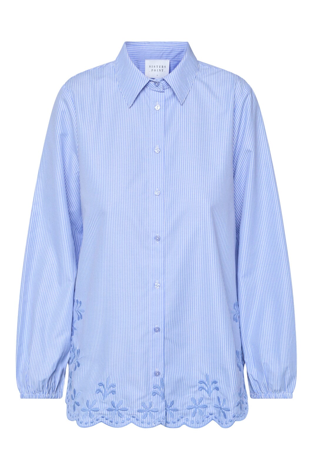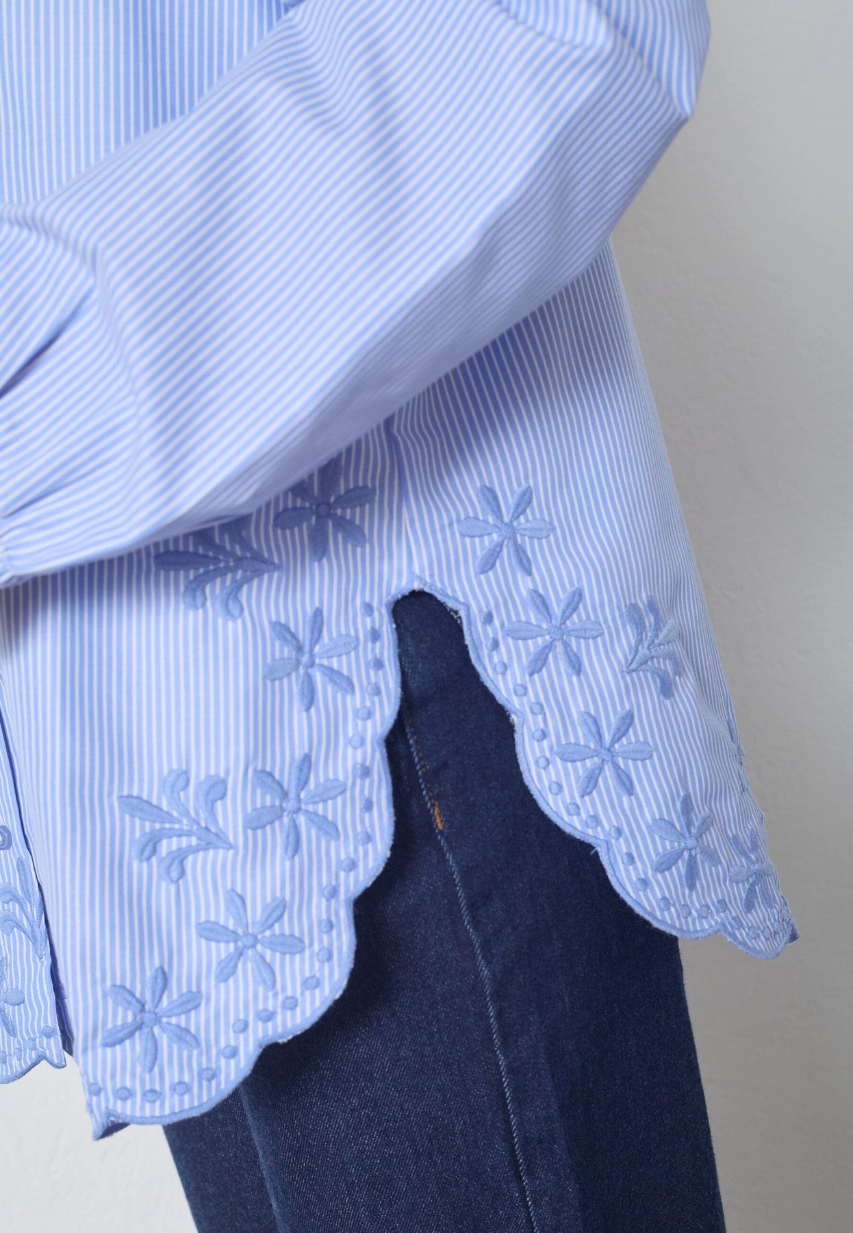 Chemise rayée de Sisters Point avec des rayures bleu clair et blanches. La chemise présente des fleurs brodées le long de l’ourlet inférieur.
