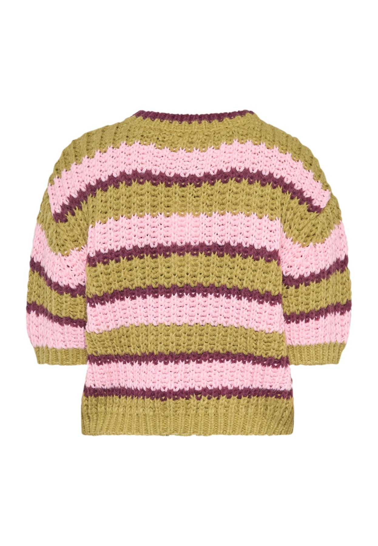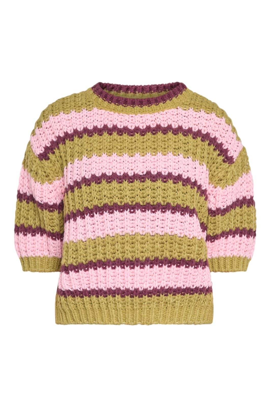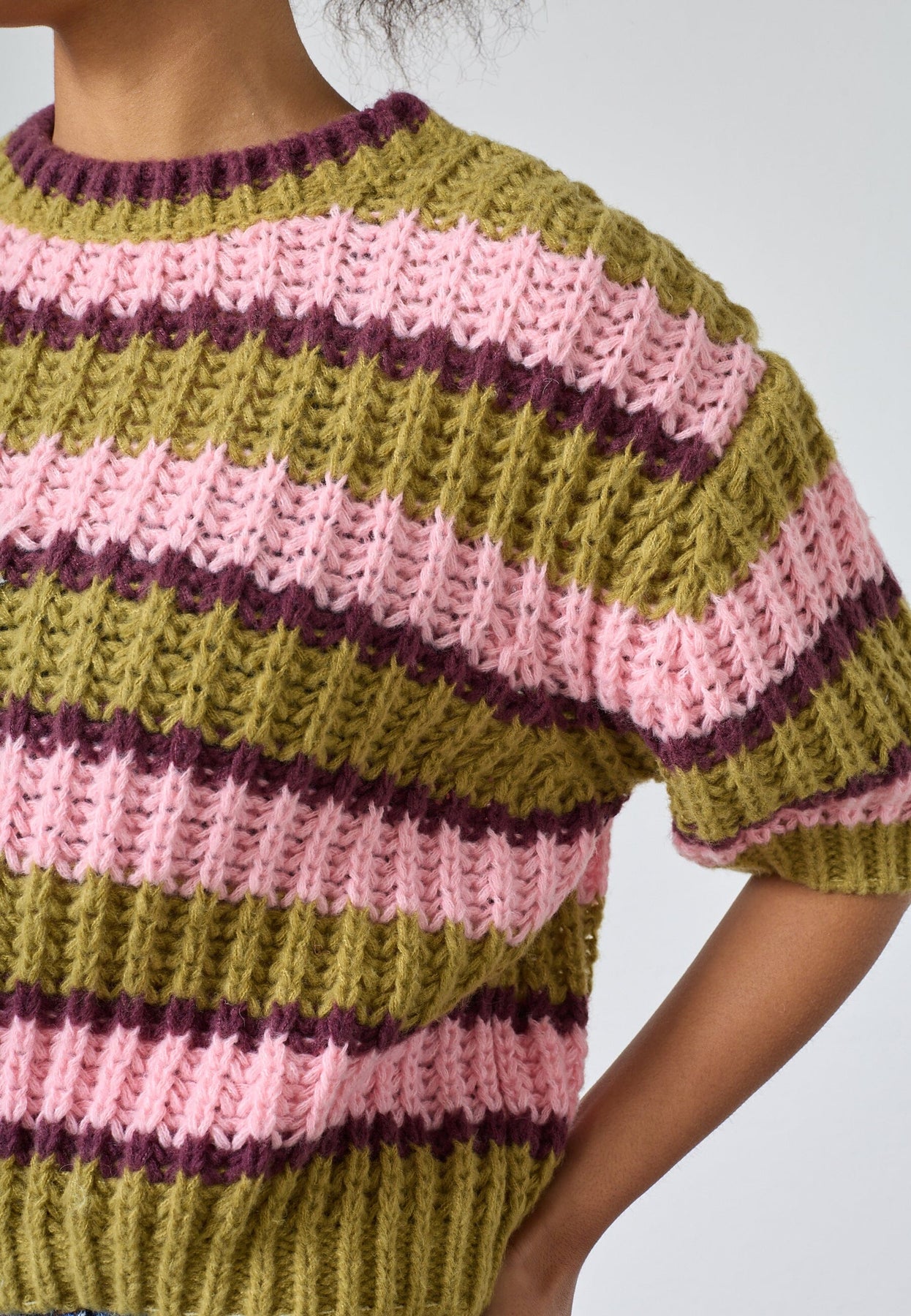 Pull en maille Sisters Point à larges rayures vert citron, rose et bordeaux. Le pull présente une texture en grosse maille et une coupe courte cropped.