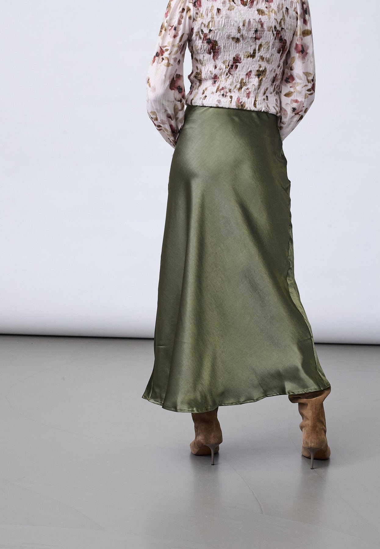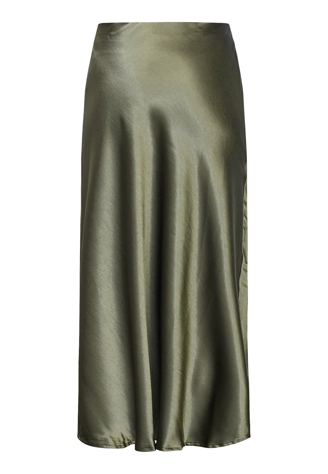 Jupe de Sisters Point, confectionnée en satin dans une teinte vert olive. La jupe présente une coupe évasée (A-line) et une longueur mi-mollet.
