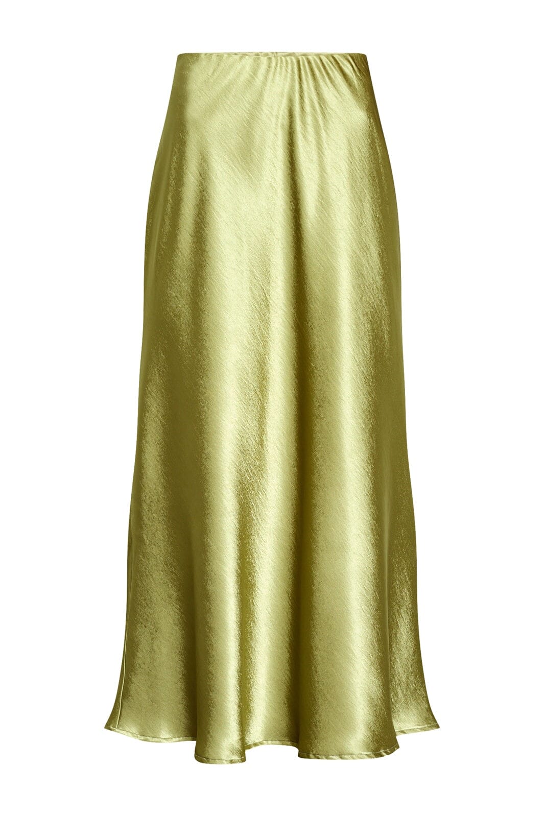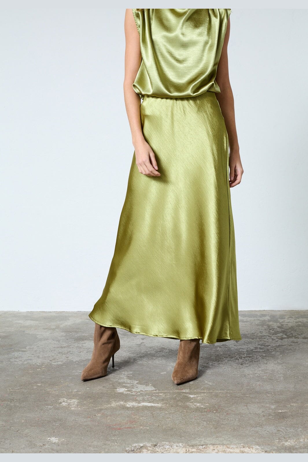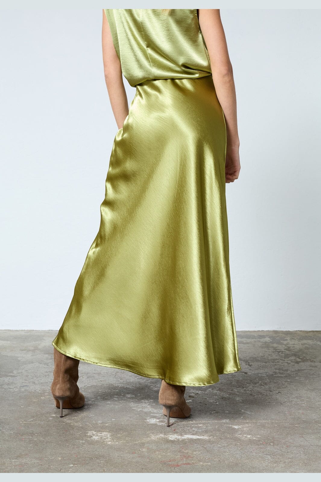 Jupe longue de Sisters Point en satin vert citron. La jupe présente une coupe évasée fluide et une surface brillante.