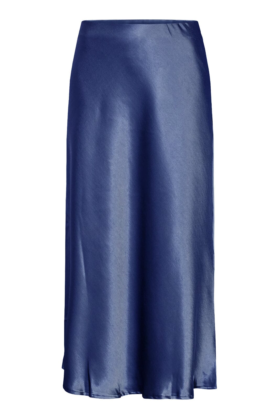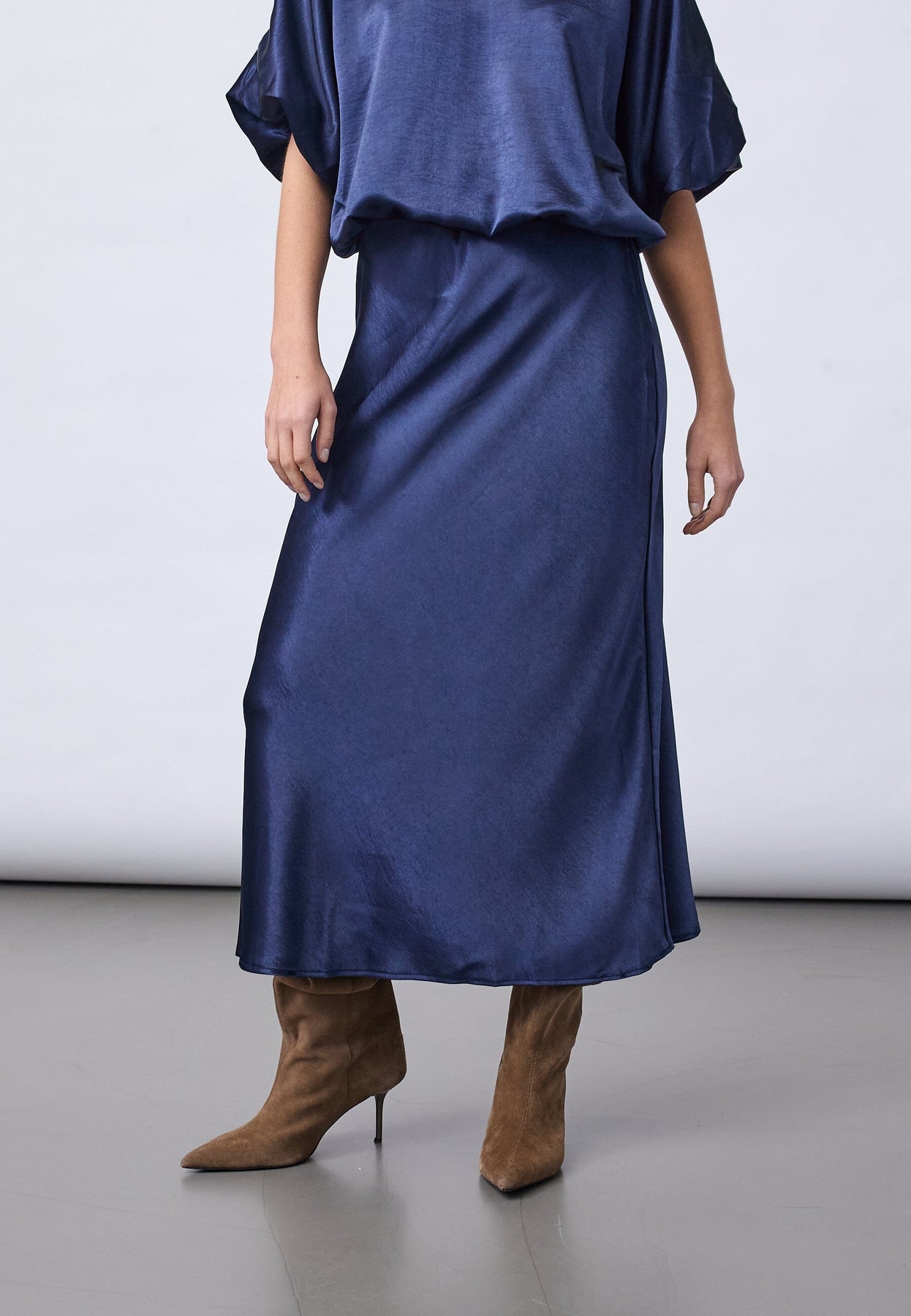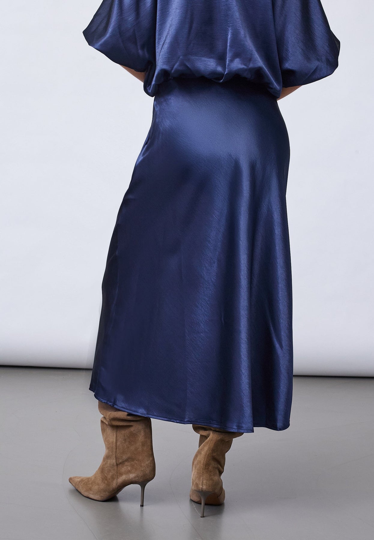 Jupe de Sisters Point en bleu marine 100 % polyester. La jupe a une longueur mi-mollet et une coupe évasée de type A-line.