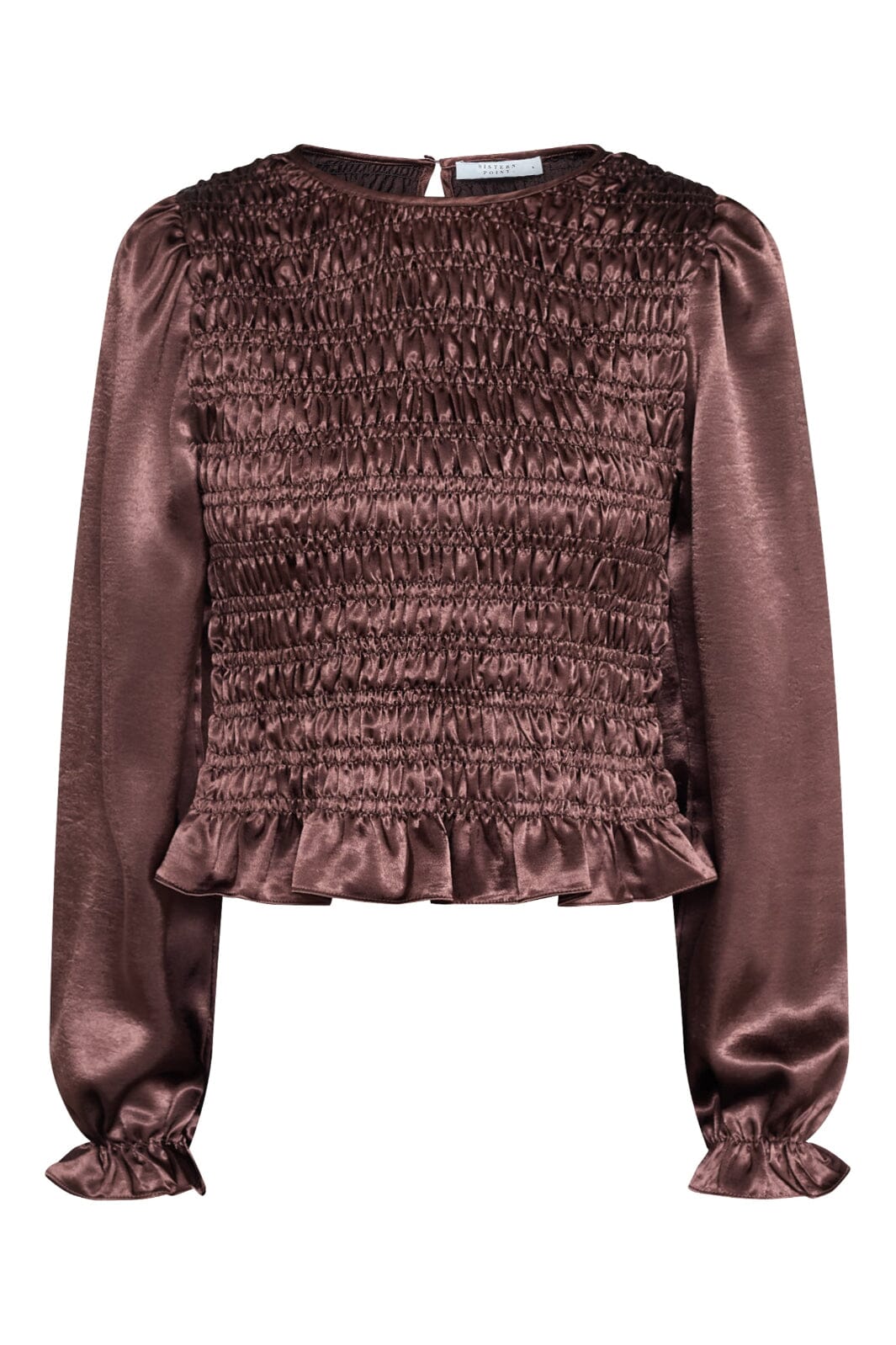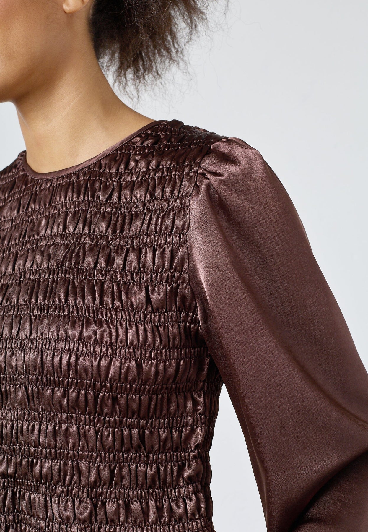 Blouse marron de Sisters Point, confectionnée en satin. La blouse présente un col rond, des manches longues avec un léger effet bouffant et un smock ajusté sur la poitrine et le dos.