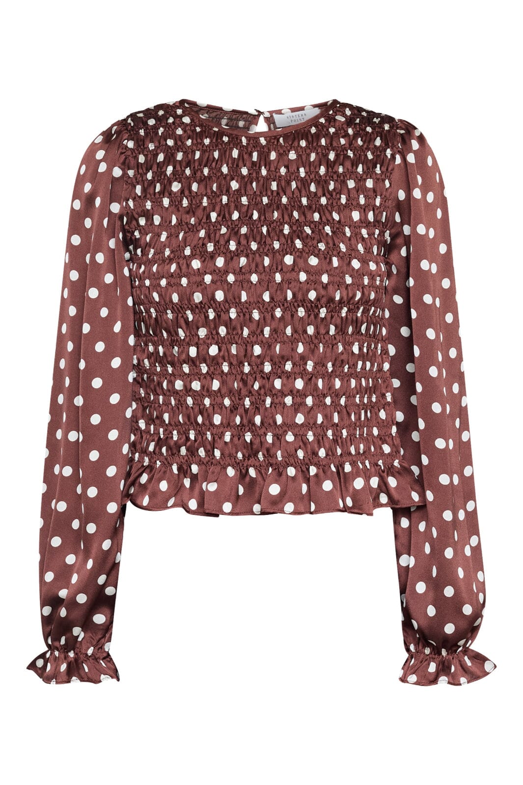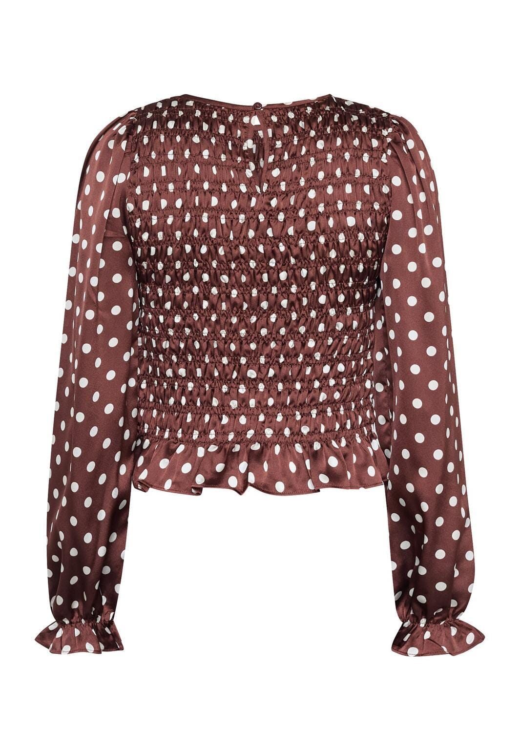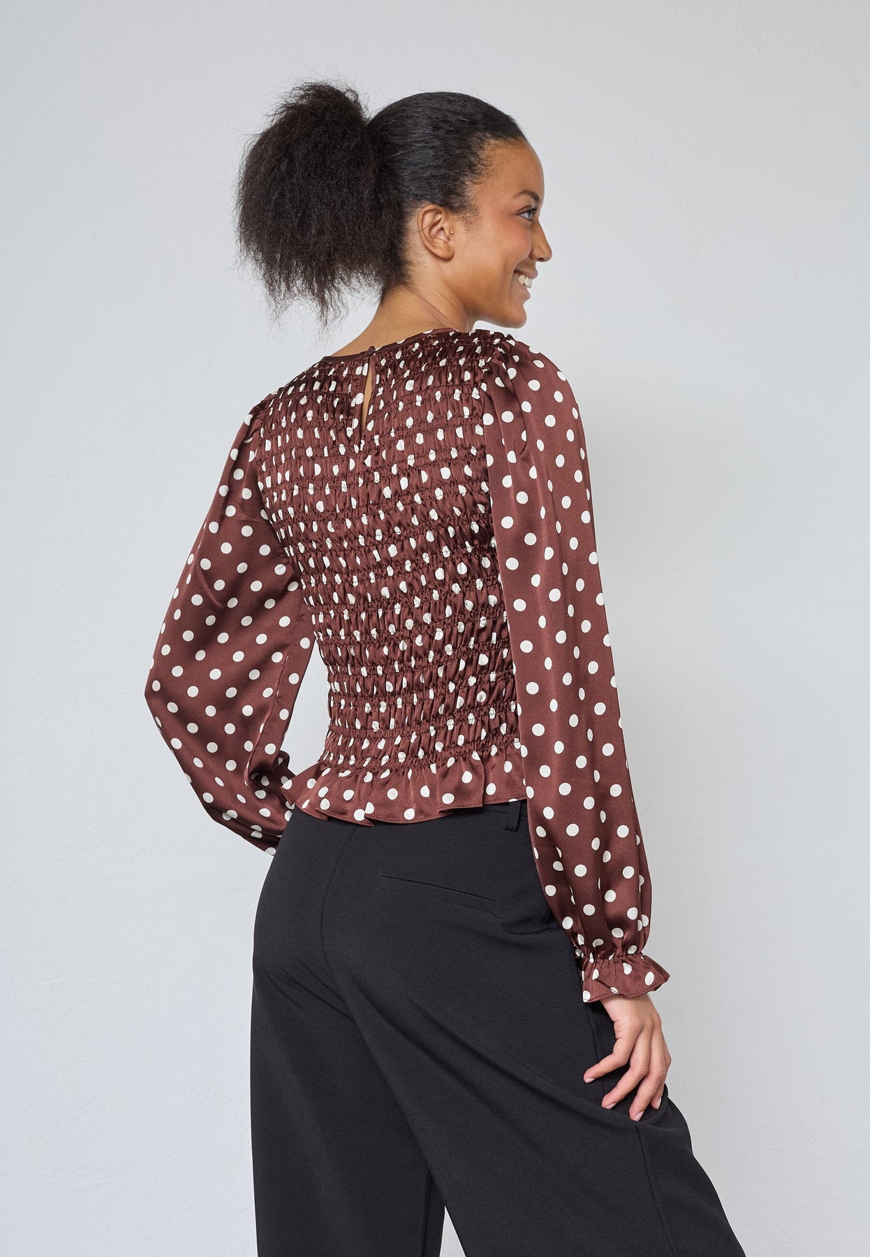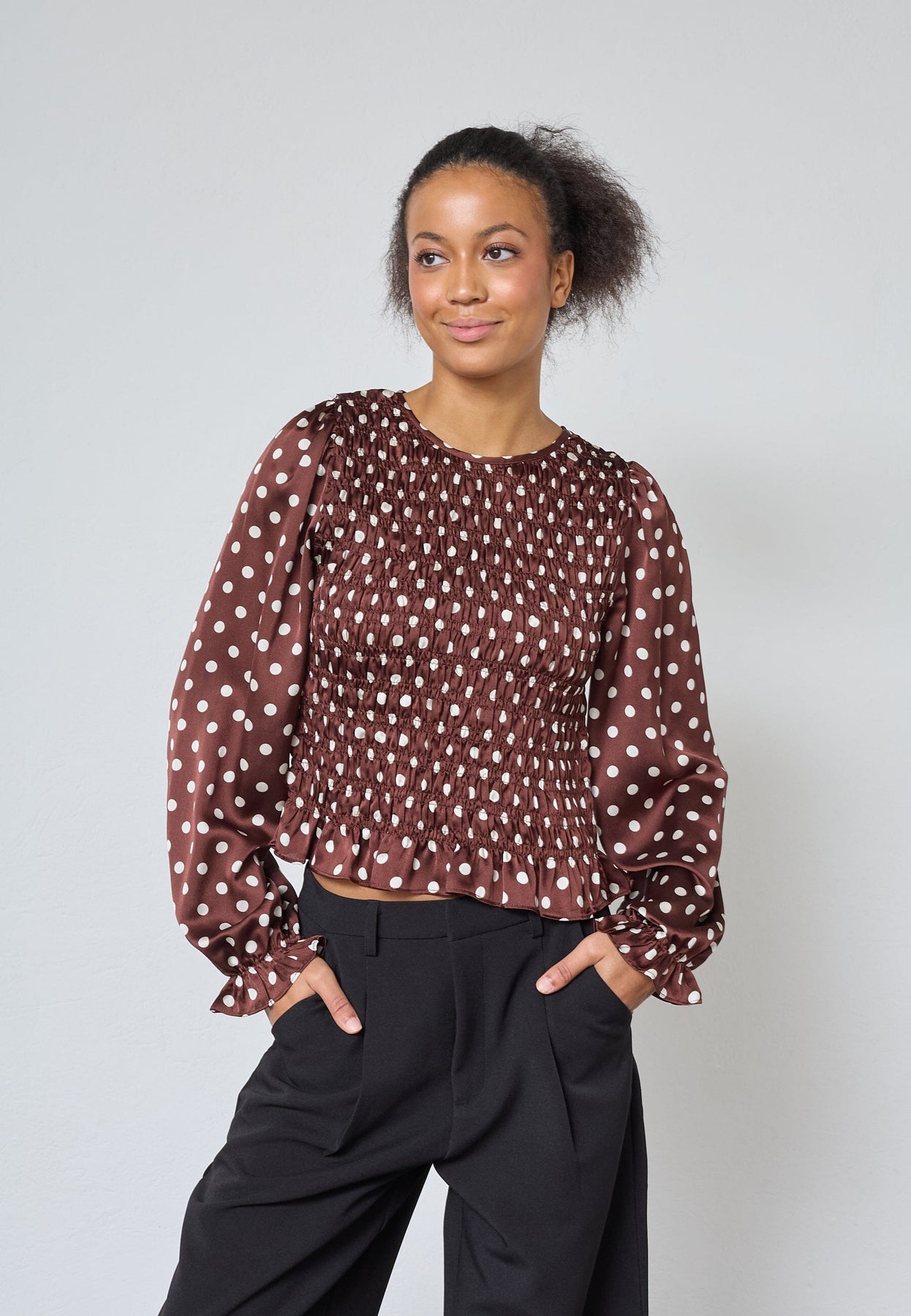 Blouse Sisters Point en satin marron à pois blancs. La blouse présente un smock ajusté sur la poitrine et le dos, des épaules légèrement bouffantes et des bords à volants à la taille et aux poignets.