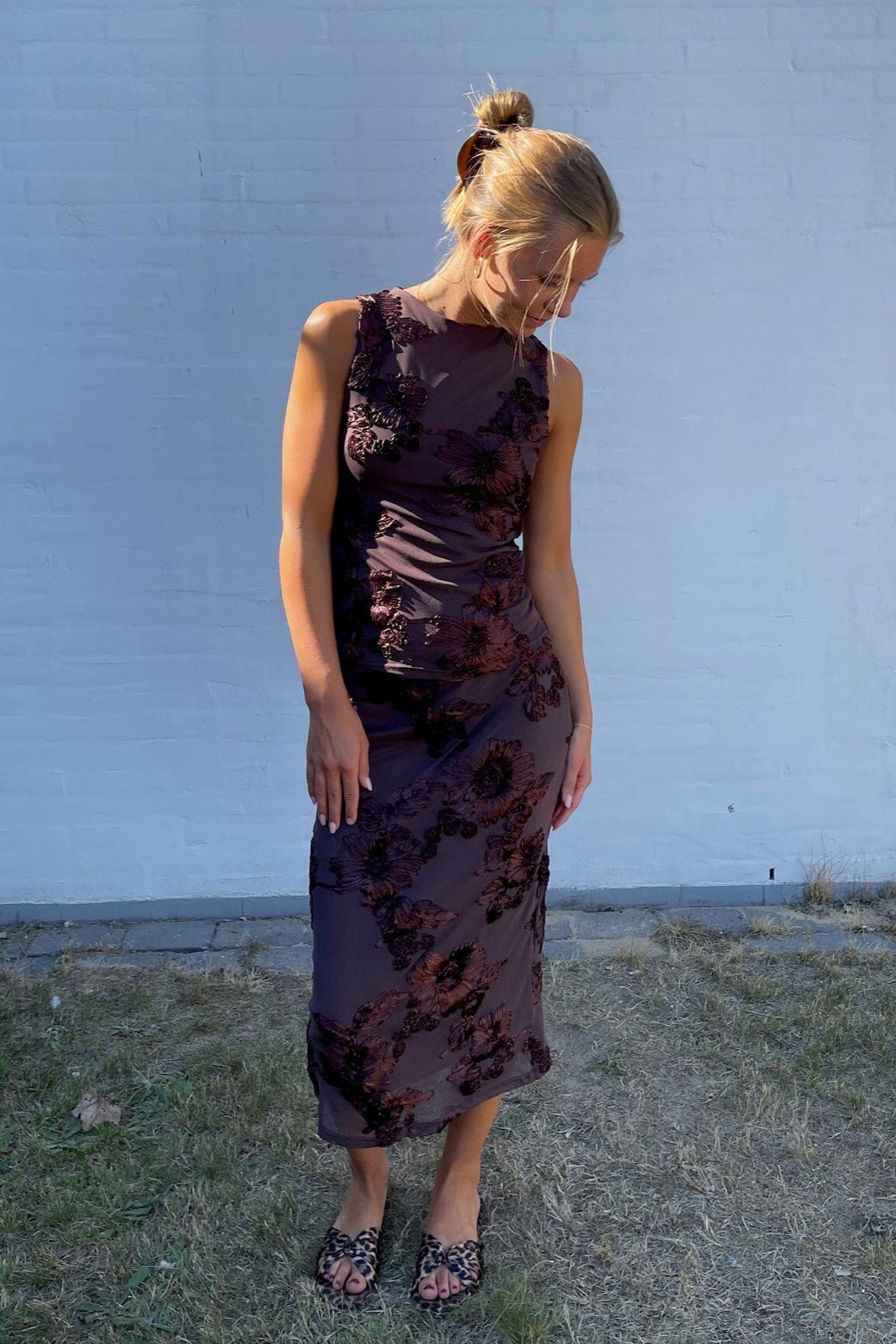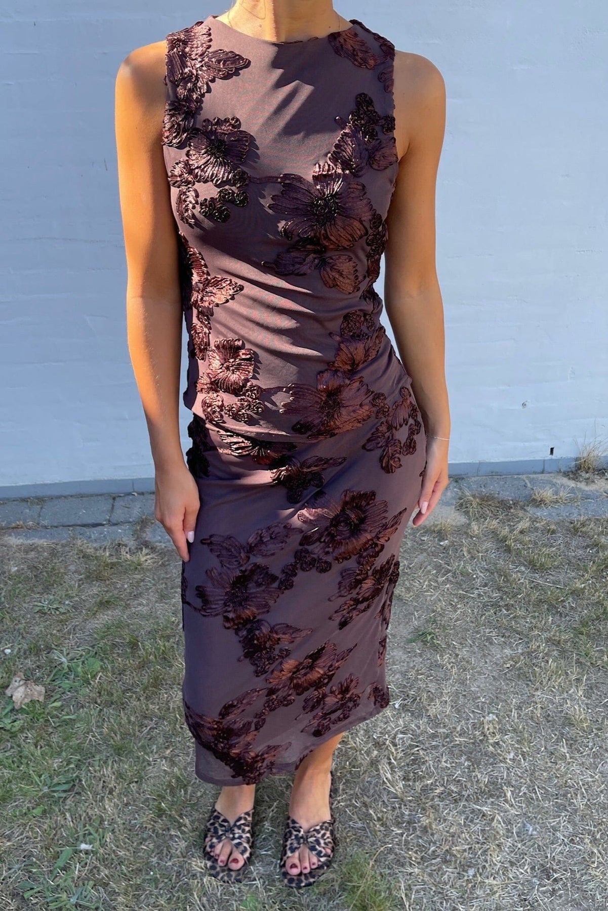 Une robe marron de Sisters Point avec des motifs floraux brodés et des paillettes. La robe a une coupe ajustée et est sans manches avec une encolure ronde.