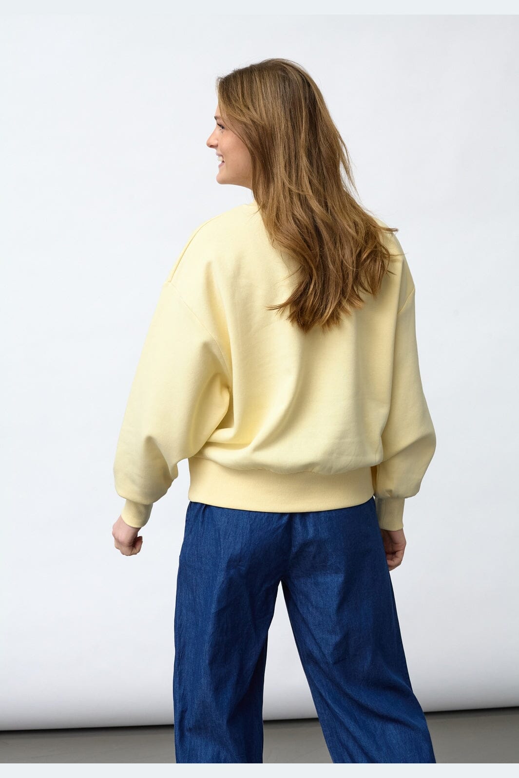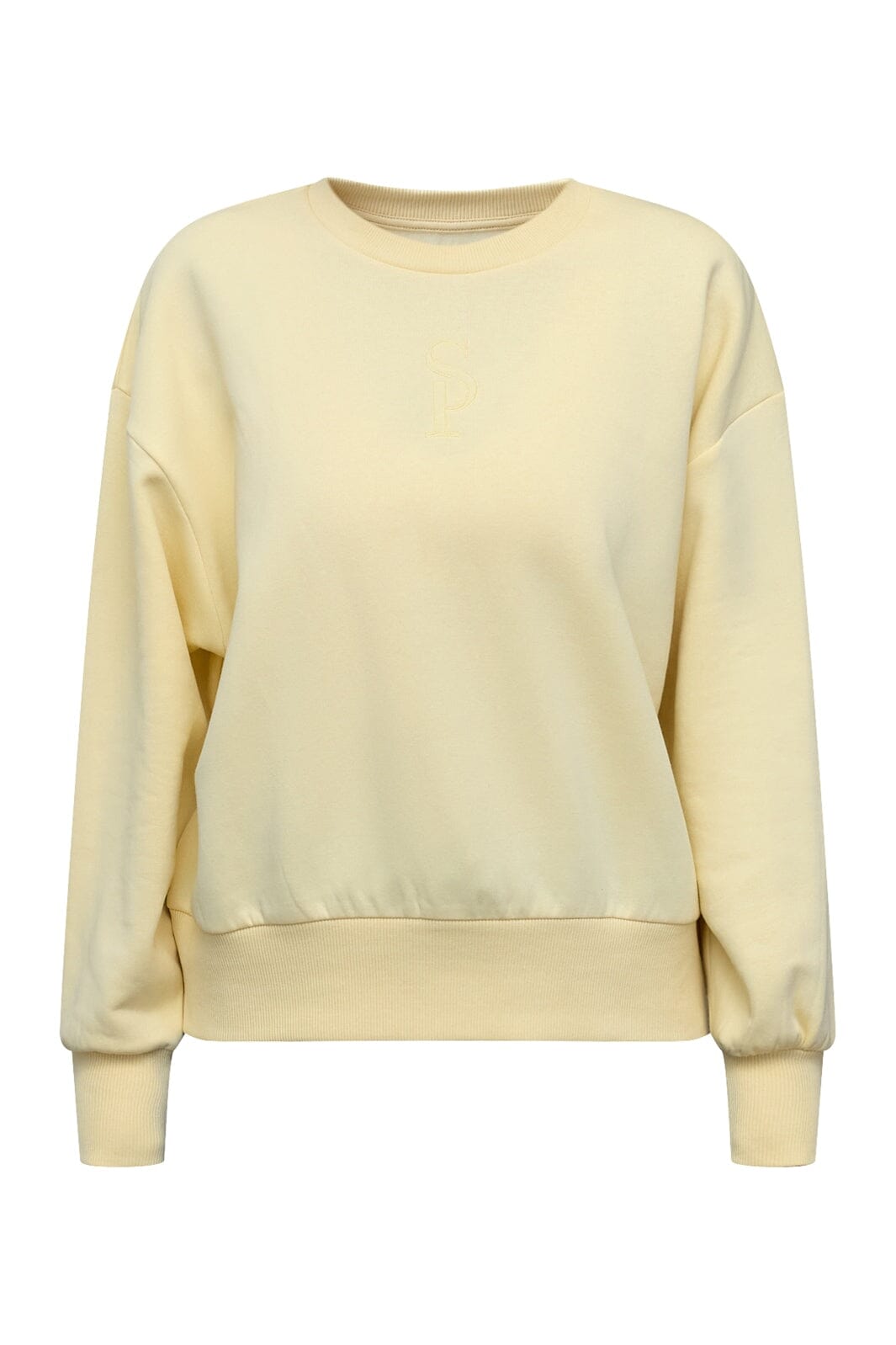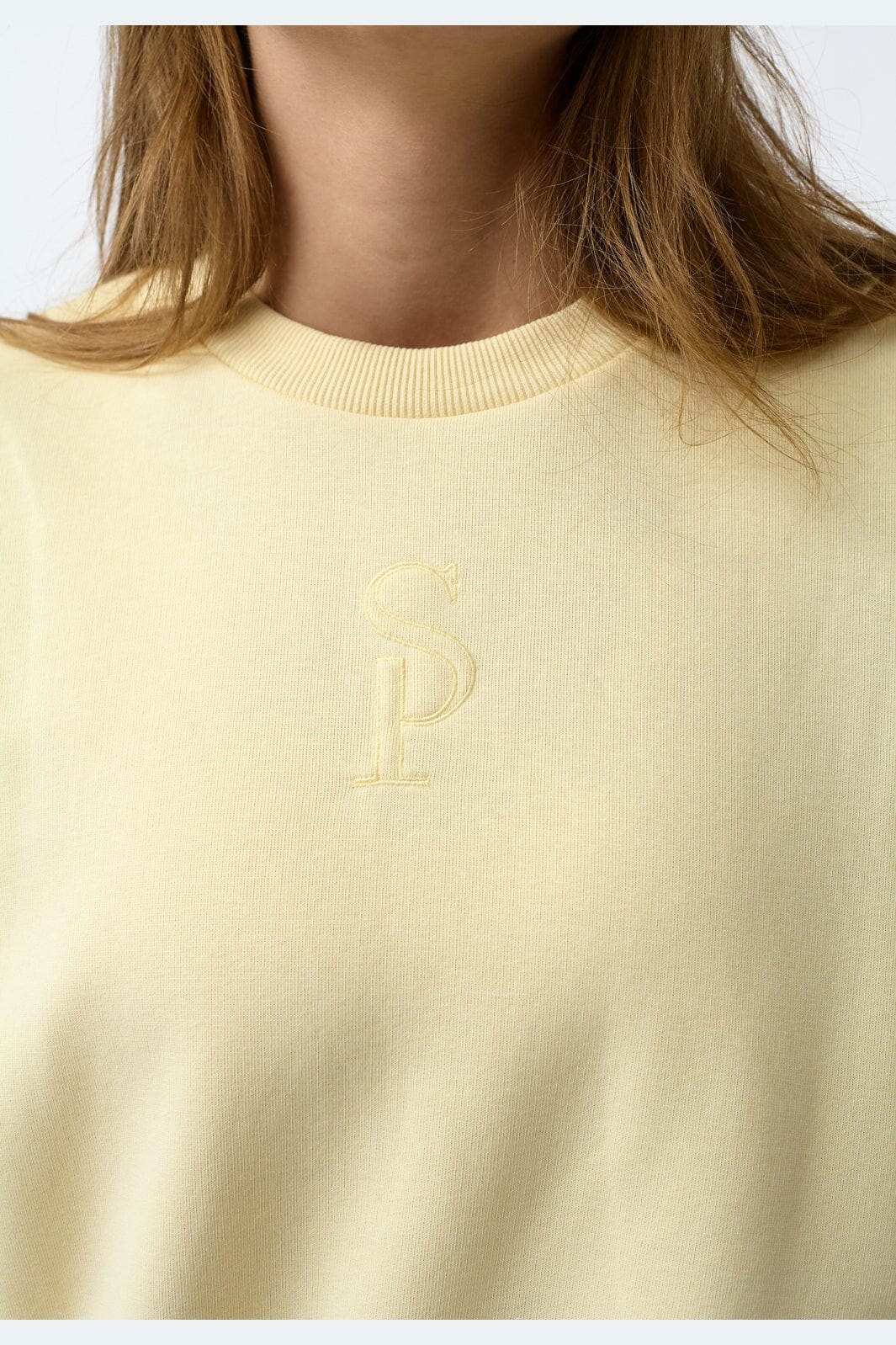 Un sweat-shirt jaune clair de Sisters Point, fabriqué en coton et polyester. Le sweat-shirt présente des détails brodés sur la poitrine et une coupe oversize.