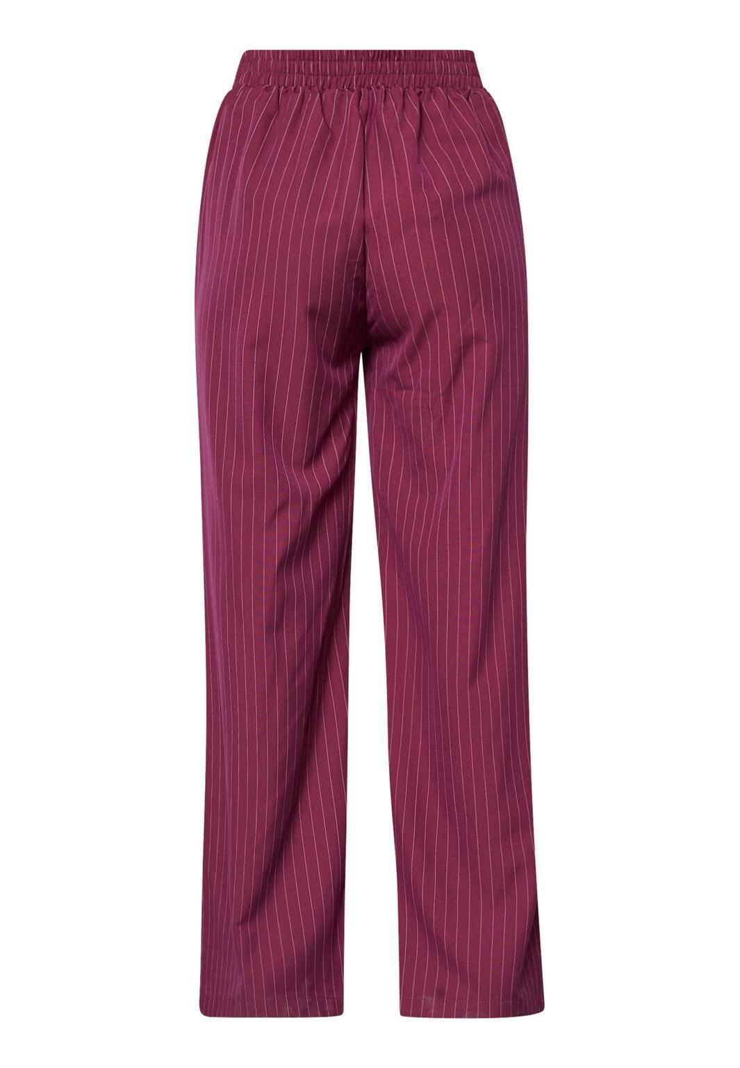 Pantalon Sisters Point bordeaux et crème à fines rayures verticales. Le pantalon présente une coupe ample, une longueur jusqu’au sol et une taille élastique.