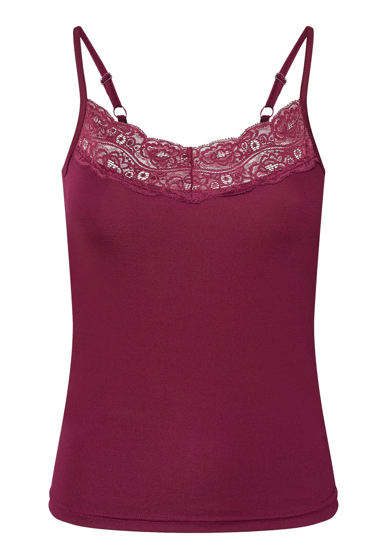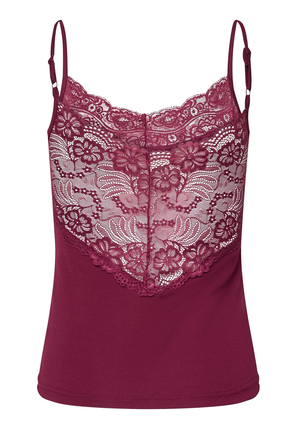 Top de Sisters Point dans un bordeaux profond avec des détails en dentelle au niveau de l’encolure. Le top possède des bretelles spaghetti réglables et une coupe près du corps.