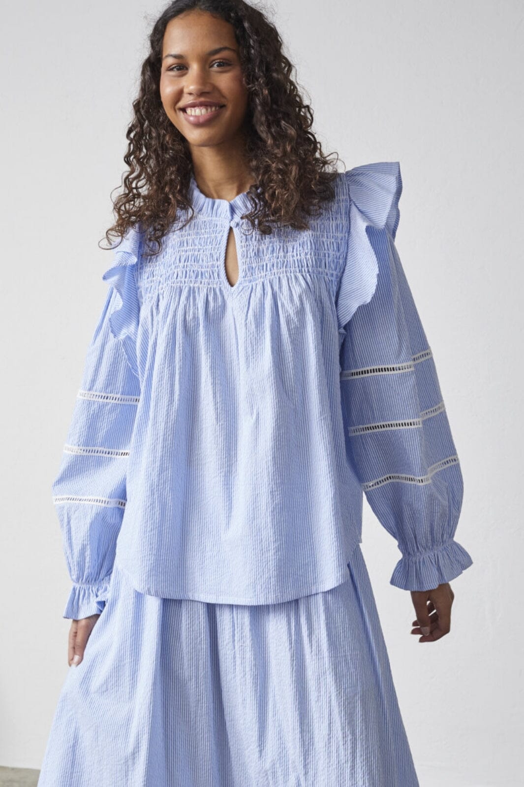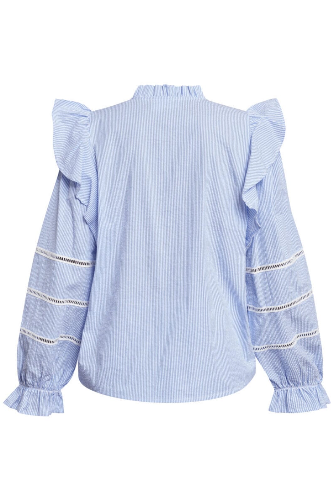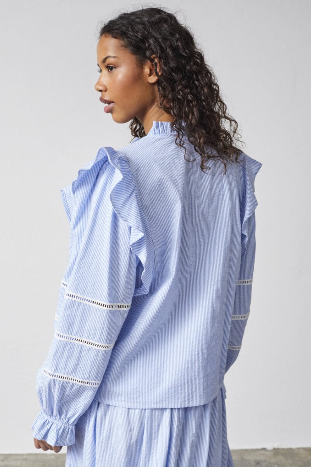 Blouse rayée bleue et blanche de Sisters Point avec col montant et détails en volants. La blouse a de longues manches avec élastique au poignet et de petits volants aux épaules.