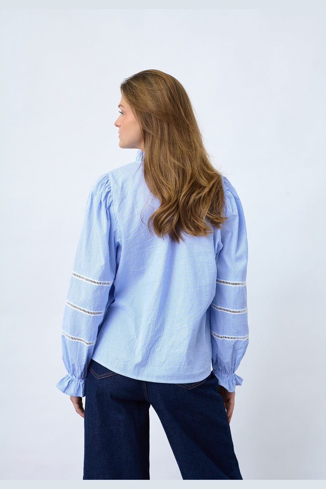 Blouse de Sisters Point en bleu et blanc à rayures. La blouse est un pull-over avec un col montant et des manches longues.