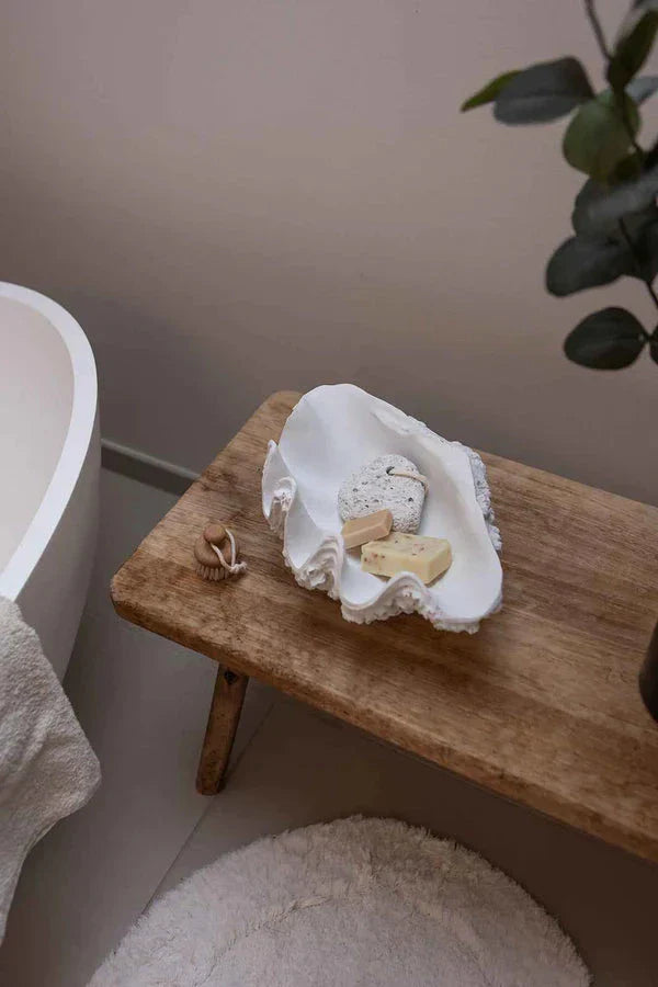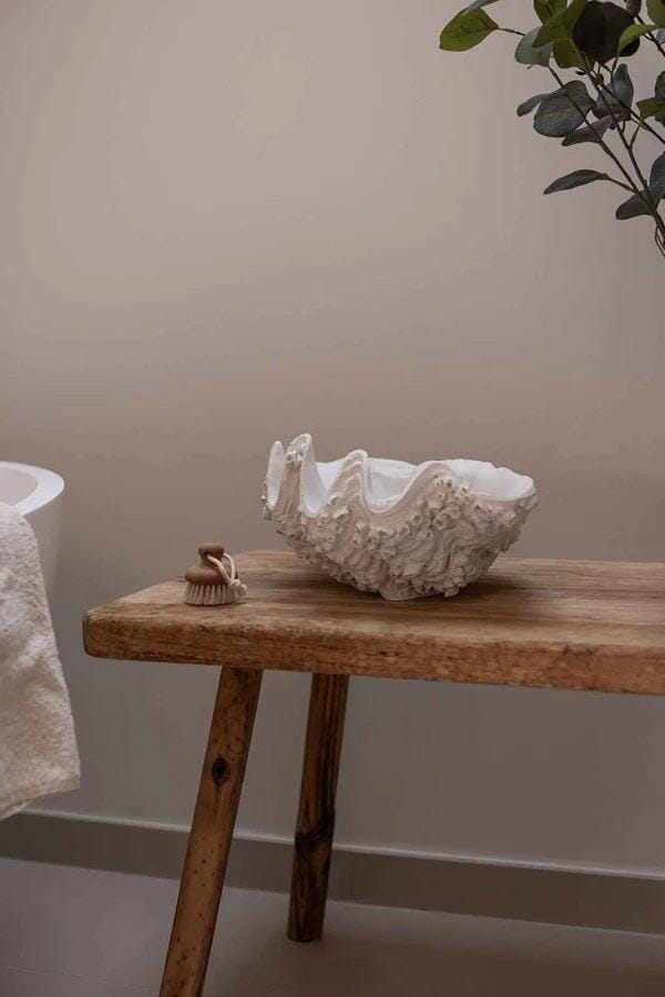 Bol blanc de Specktrum en forme de coquillage. Il a une surface avec des motifs naturels et un intérieur lisse et brillant. Le bol allie style décoratif et fonctionnalité pratique.
