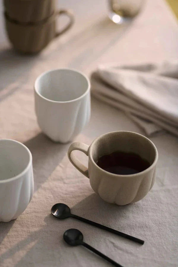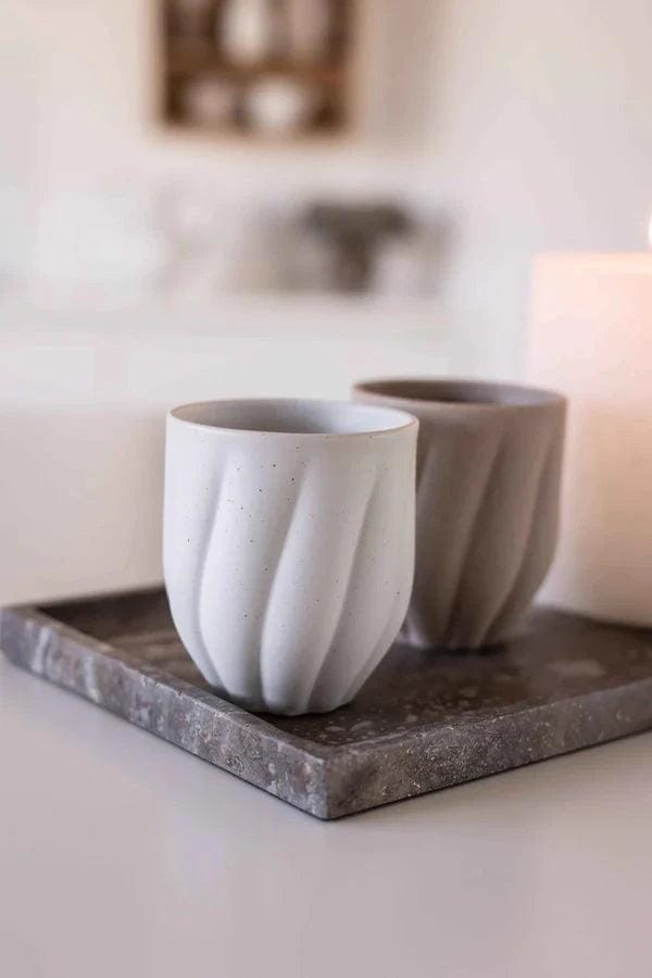 Tasse en céramique de Specktrum avec des lignes ondulées à la surface. La tasse off-white a une forme légèrement rétrécie vers le bas et est conçue sans anse pour un aspect épuré.