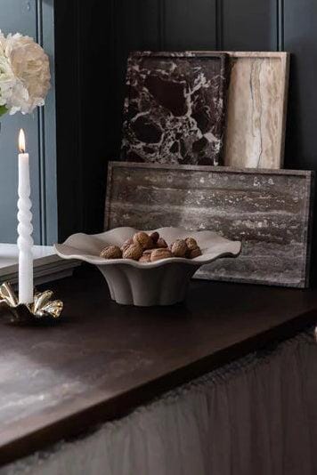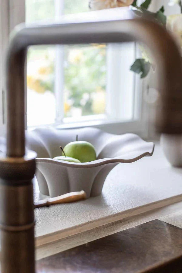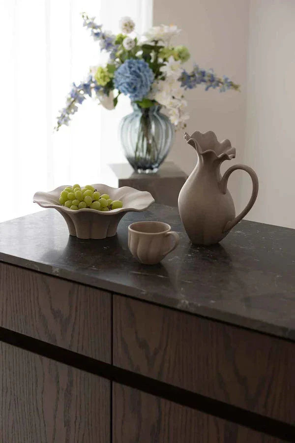 Bol en céramique couleur sable de Specktrum avec un bord ondulé et une surface mate. Le bol est fabriqué selon un artisanat traditionnel, ce qui donne à chaque pièce son propre caractère.