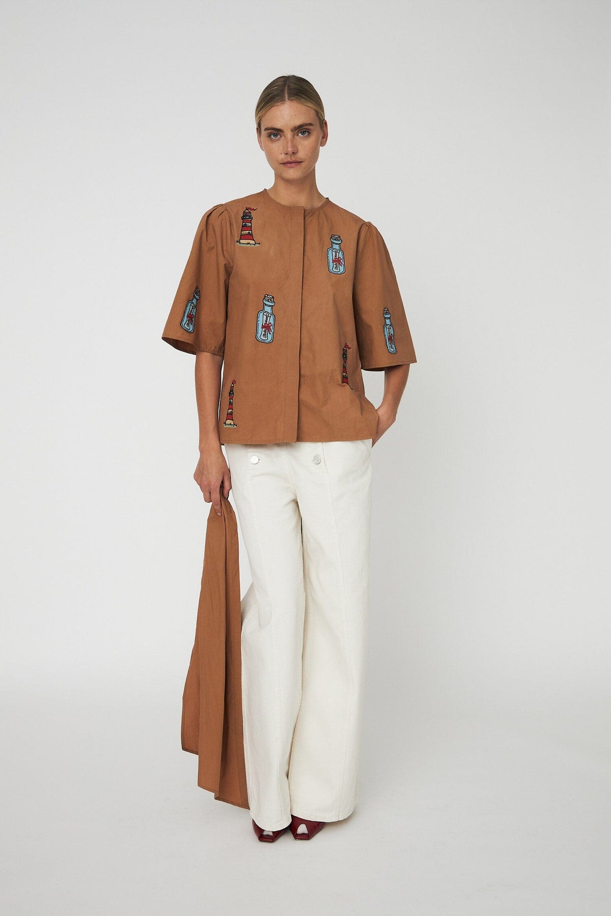 Chemise marron de Stella Nova, confectionnée en 100 % coton biologique. La chemise présente des motifs brodés de phares et de bouteilles ainsi qu’un grand nœud au niveau du cou.