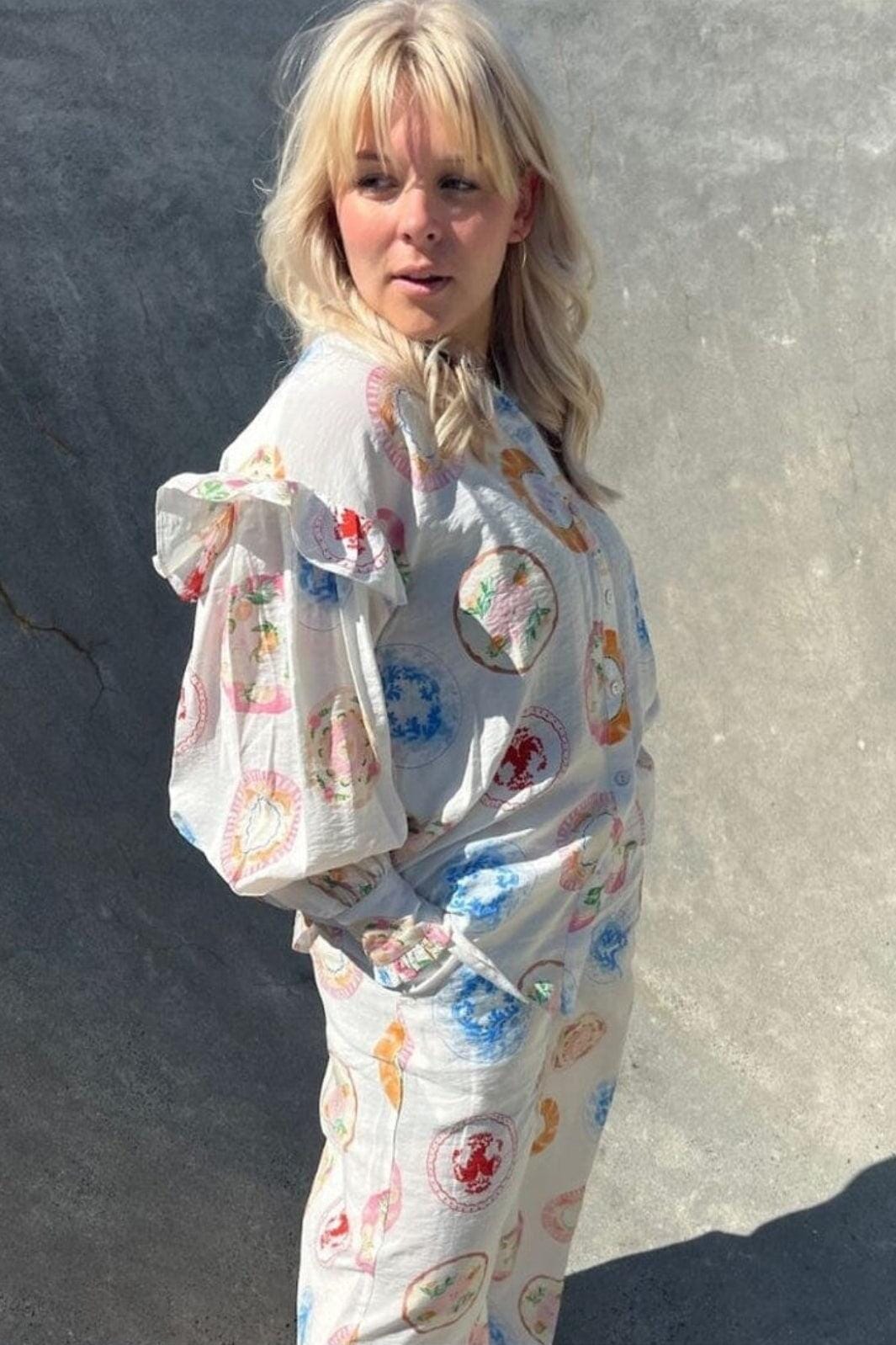 Une chemise de Stories From The Atelier By Copenhagen Shoes avec un motif multicolore composé de motifs circulaires de différentes couleurs.