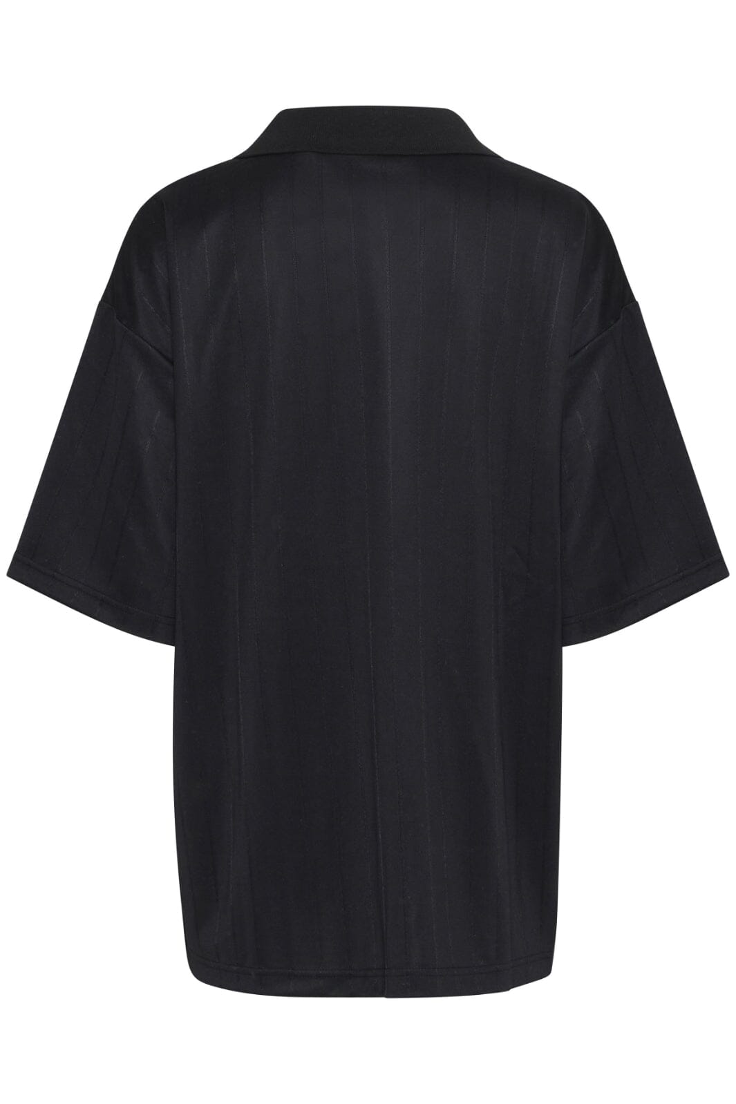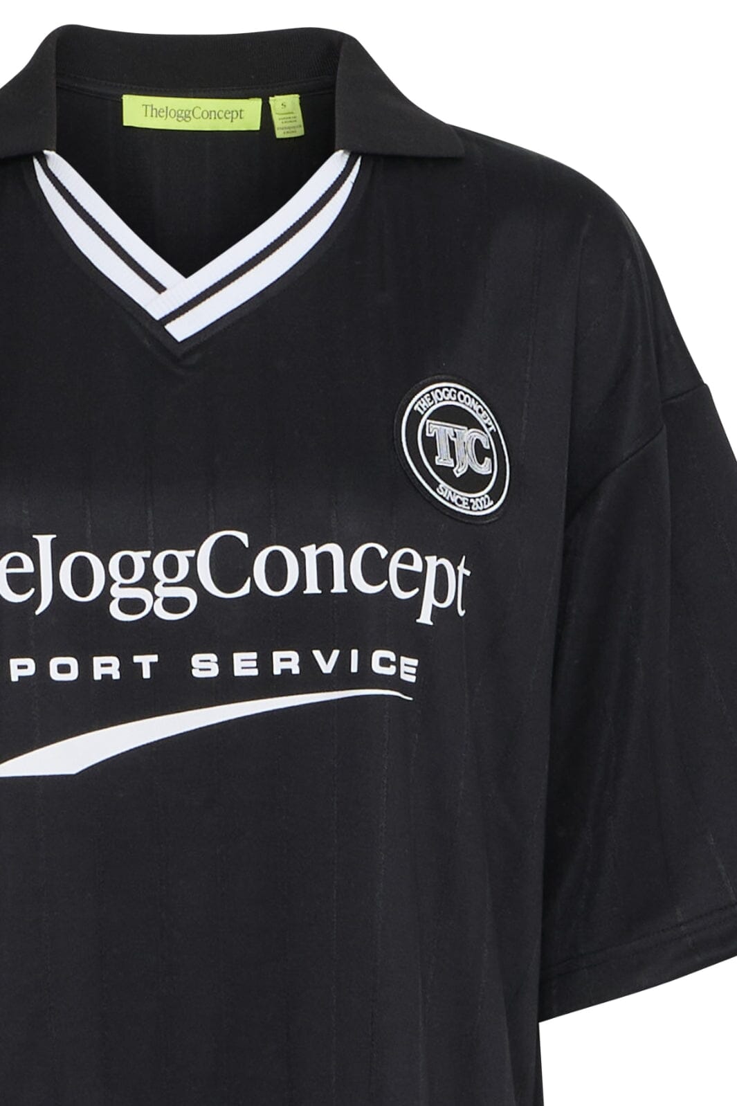 T-shirt noir de The Jogg Concept avec col en V et un motif rayé subtil. Le t-shirt a un style sportif et est fabriqué en polyester recyclé.