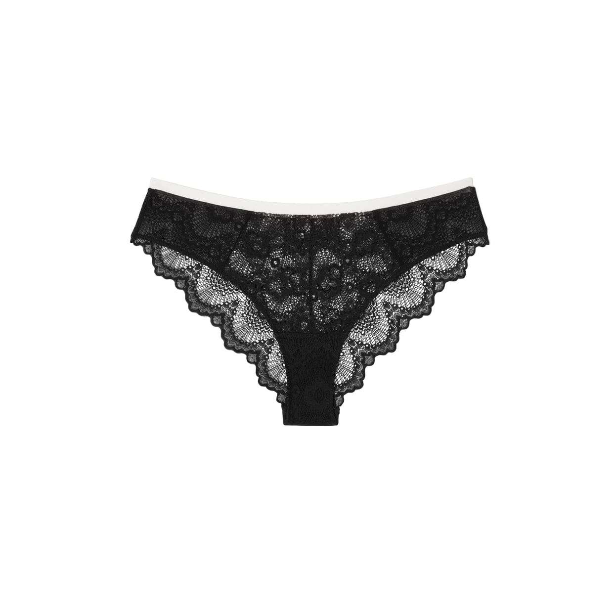 Slip noir coquin avec motif floral en dentelle. Le slip a une large bordure en dentelle et des inserts latéraux en matériau lisse qui offrent une bonne liberté de mouvement.