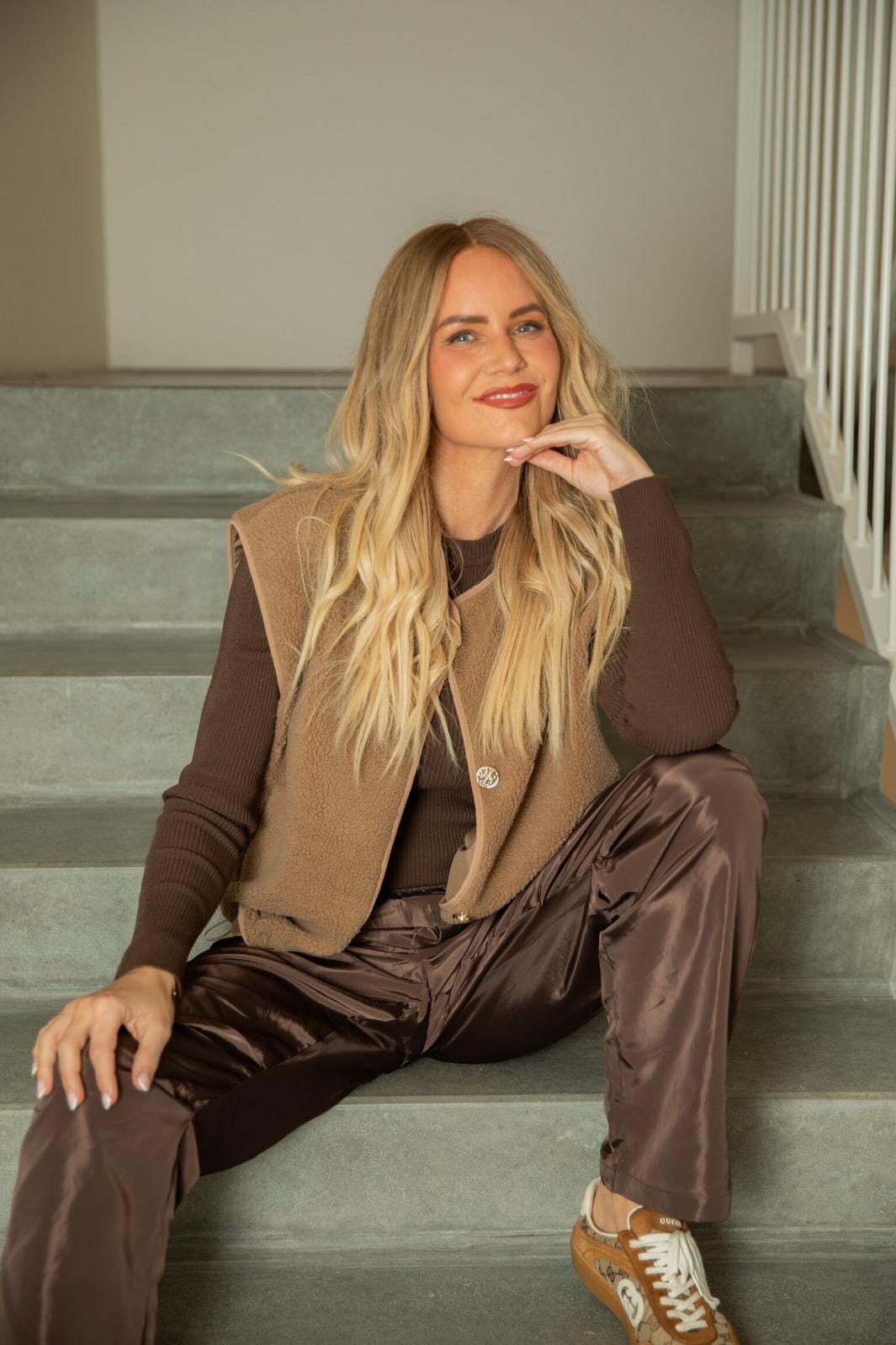 Gilet duveteux de Valentin Studio dans une teinte sable foncé. Le gilet présente une coupe sans manches avec encolure ronde et est fabriqué en 100 % polyester.