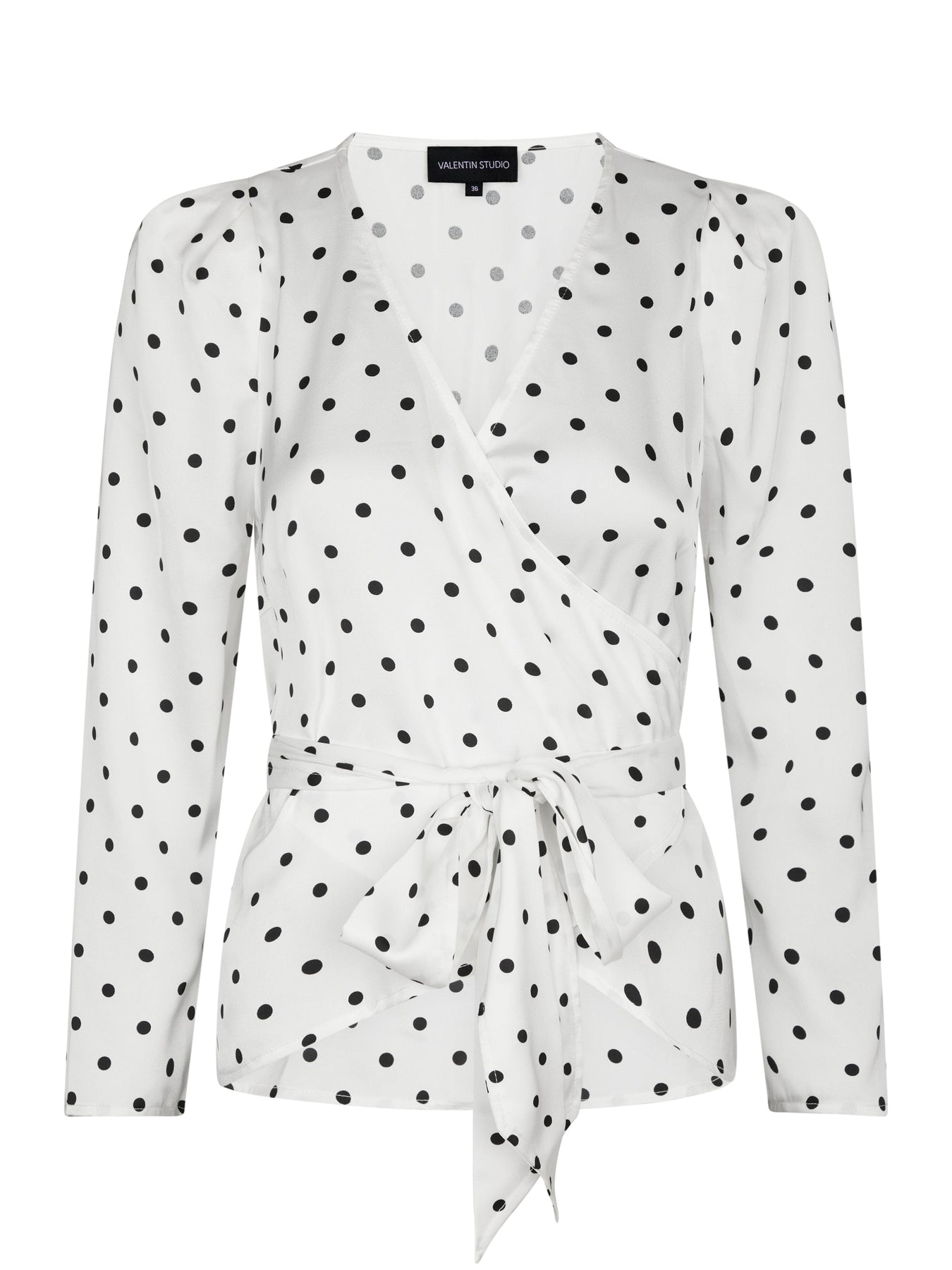 Blouse blanche de Valentin Studio à pois noirs. La blouse a des manches longues, un col en V et un lien à nouer sur le devant.