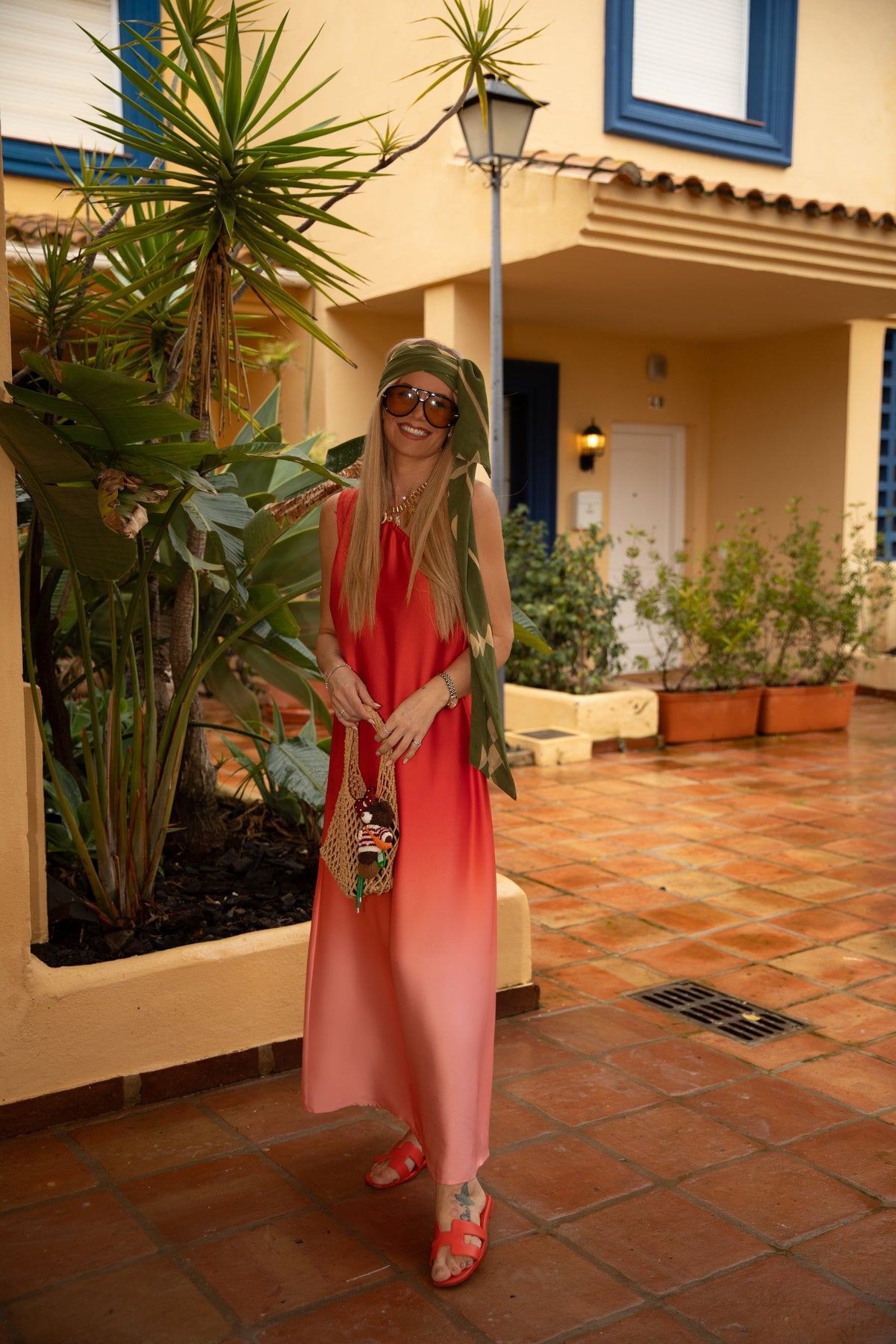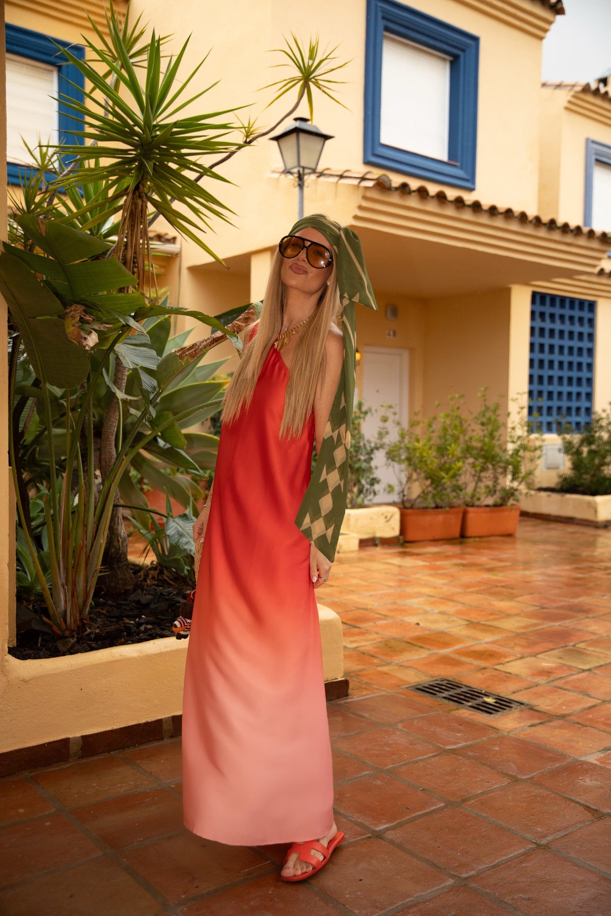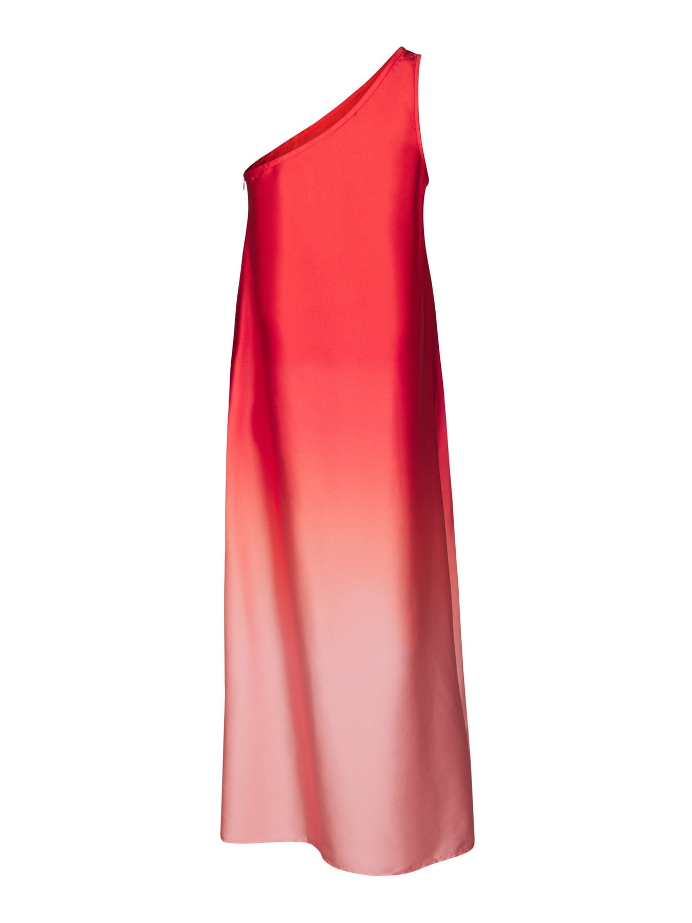 Robe rouge Valentin Studio avec dégradé ombré et design épaules dénudées. La robe est longueur cheville et présente une coupe ample.